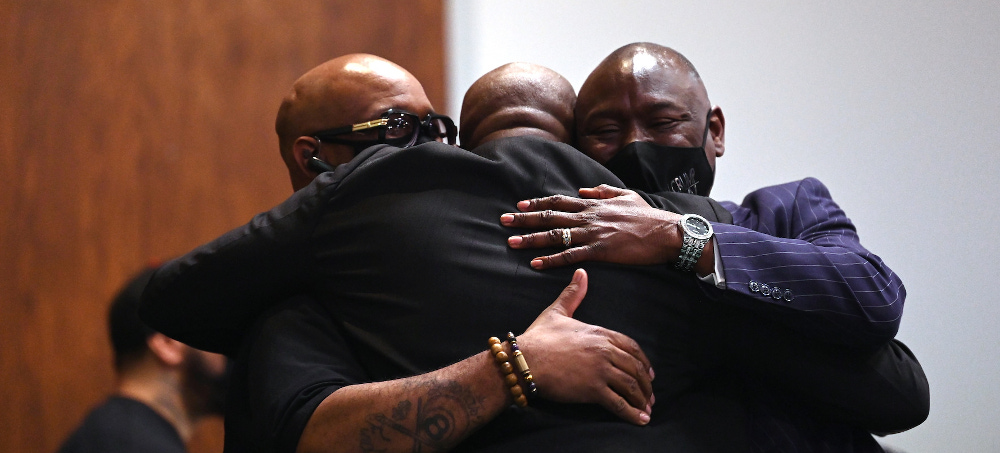 Philonise Floyd, center, is embraced by his brother Terrence Floyd, left, and attorney Benjamin Crump during a prayer vigil for George Floyd's family in Minneapolis last March. (photo: Joshua Lott/The Washington Post)