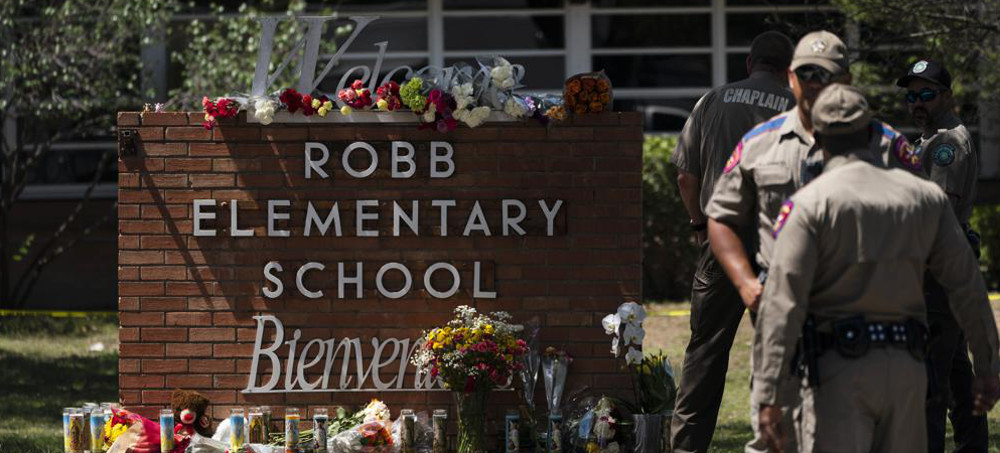 Flowers and candles are placed outside Robb Elementary School in Uvalde, Texas, Wednesday, May 25, 2022, to honor the victims killed in Tuesday's shooting at the school. (photo: Jae C. Hong/AP)
