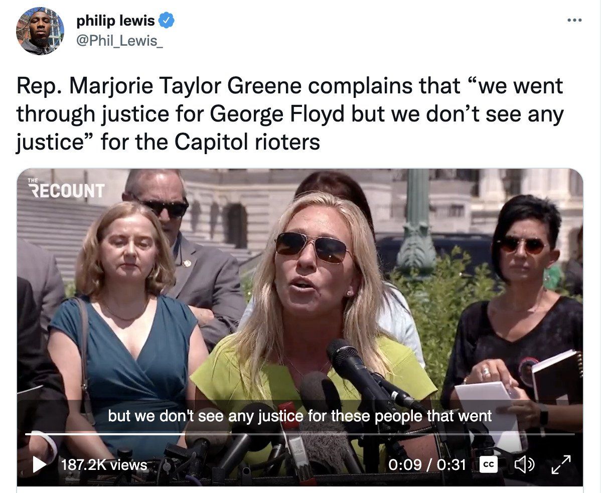 In response to the January 6 committee hearings in Congress, white supremacist Rep. Marjorie Taylor Greene complained in an interview that “we went through justice for George Floyd but we don’t see any justice” for the Capitol rioters.