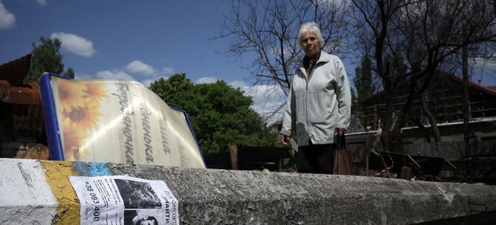 A woman in Borodianka, Ukraine, walks past a poster seeking information on people who have gone missing during the Russian invasion. (photo: Christopher Furlong/Getty)