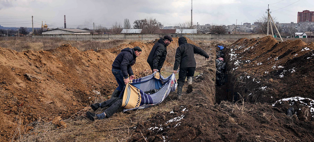 Dead bodies are put into a mass grave on the outskirts of Mariupol. (photo: Evgeniy Maloletka/AP)