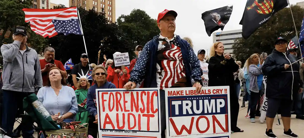 Protesters call for a 'forensic audit' of the 2020 presidential election in Lansing, Michigan, in October 2021. (photo: Jeff Kowalsky/AFP/Getty Images)
