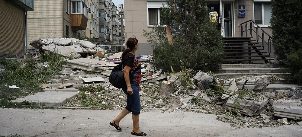A woman walks past a bombed building in Nikopol. (photo: Christopher Cherry/Guardian UK)