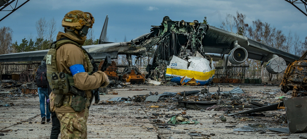 A Ukrainian soldier at the Kyiv airport, where the author and his wife were held captive by the Russians. (photo: Celestino Arce/NurPhoto/Getty Images)