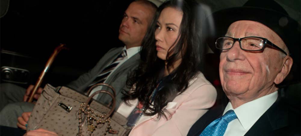Media magnate Rupert Murdoch, at right, in London a decade ago on his way to give evidence at a British judicial inquiry. He is accompanied by his son (and now Fox Corp boss) Lachlan Murdoch, at left, and his then-wife Wendi Deng. (photo: Leon Neal/AFP/Getty Images)