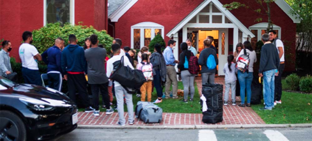 Immigrants gather with their belongings outside St. Andrews Episcopal Church, Wednesday Sept. 14, 2022, in Edgartown, Mass., on Martha’s Vineyard. Florida Gov. Ron DeSantis flew two planes of immigrants to Martha’s Vineyard, escalating a tactic by Republican governors to draw attention to what they consider to be the Biden administration’s failed border policies. (photo: Ray Ewing/Vineyard Gazette/AP)