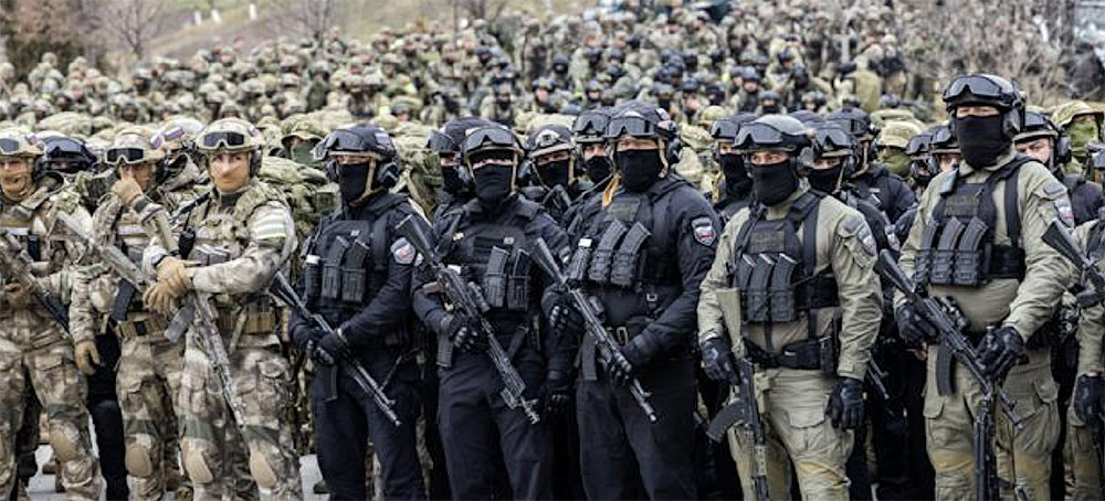 Russian servicemen take part in a review of the Chechen Republic's troops and military hardware at the residence of Ramzan Kadyrov, head of the Chechen Republic. (photo: Yelena Afonina/TASS/Getty Images)
