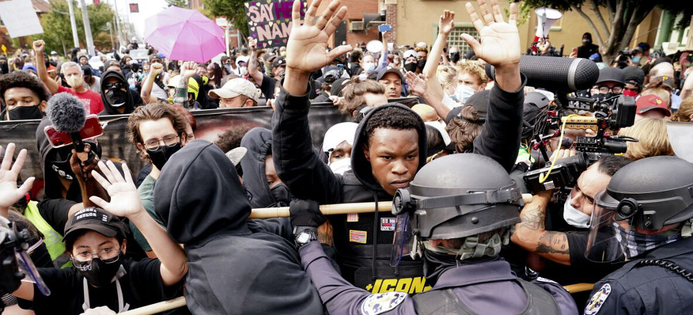 Police and protesters converge during a demonstration, Wednesday, Sept. 23, 2020, in Louisville, Ky. (photo: John Minchillo/AP)