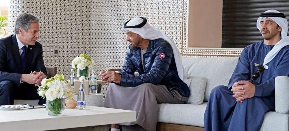 US Secretary of State Antony Blinken meets with the UAE President Mohammed bin Zayed al-Nahyan (C) and his brother and Foreign Minister Sheikh Abdullah bin Zayed al-Nahyan (R) in Rabat, Morocco. (Photo: AP)
