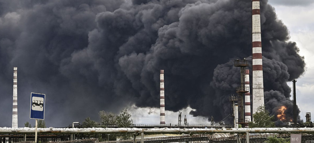 Smoke rises from an oil refinery after an attack outside the city of Lysychansk in eastern Ukraine in May. (photo: Getty)