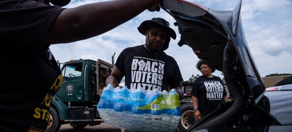 Residents distribute cases of water at Grove Park Community Center in Jackson, Mississippi, on Sept. 3, 2022. Major flooding starting in August disrupted the operation of a critical but aging water treatment plant. (photo: Seth Herald/Getty)