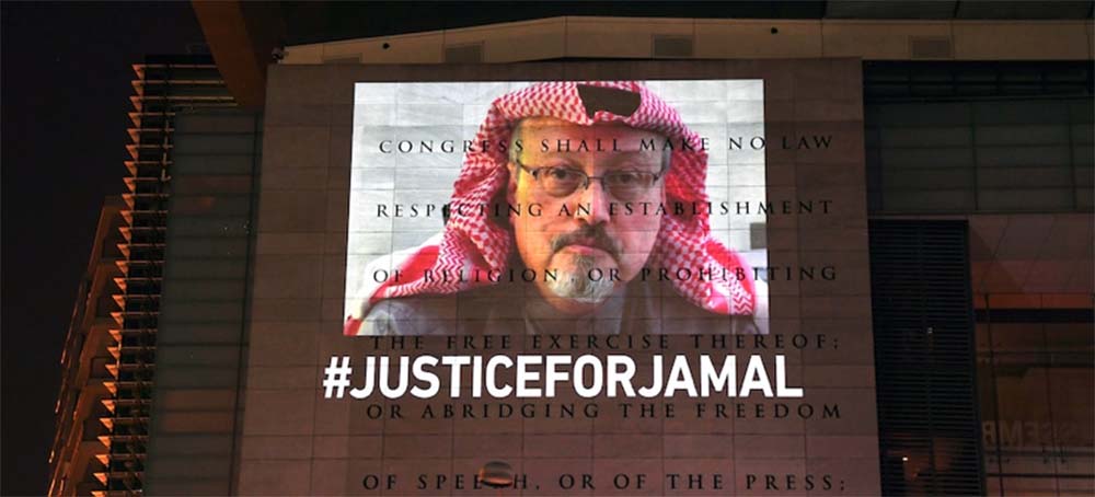 An image of the late journalist Jamal Khashoggi is projected onto the facade of the Newseum in Washington in 2019. (photo: Michael S. Williamson/WP)