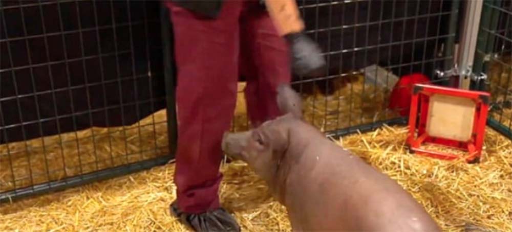 A video grab from the online Neuralink livestream shows Gertrude the pig, implanted with a Neuralink device, during a presentation in 2020. (photo: Neuralink/AFP/Getty Images)
