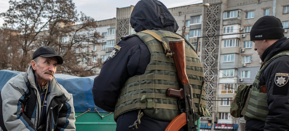 A man from occupied territories is checked by police in Zaporizhzhia. (photo: Alessio Mamo/The Guardian)