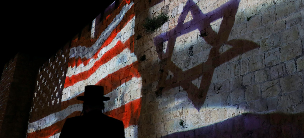 The Israeli and United States flags are projected on the walls of Jerusalem's Old City, to mark one year since the transfer of the U.S. Embassy from Tel Aviv to Jerusalem, on May 15, 2019. (photo: Ahmad Gharabli/Getty)