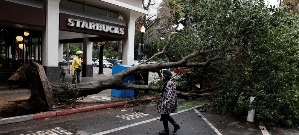 Pedestrians walk around a tree that fell during a storm in downtown Sacramento, California. (photo: Fred Greaves/Reuters)
