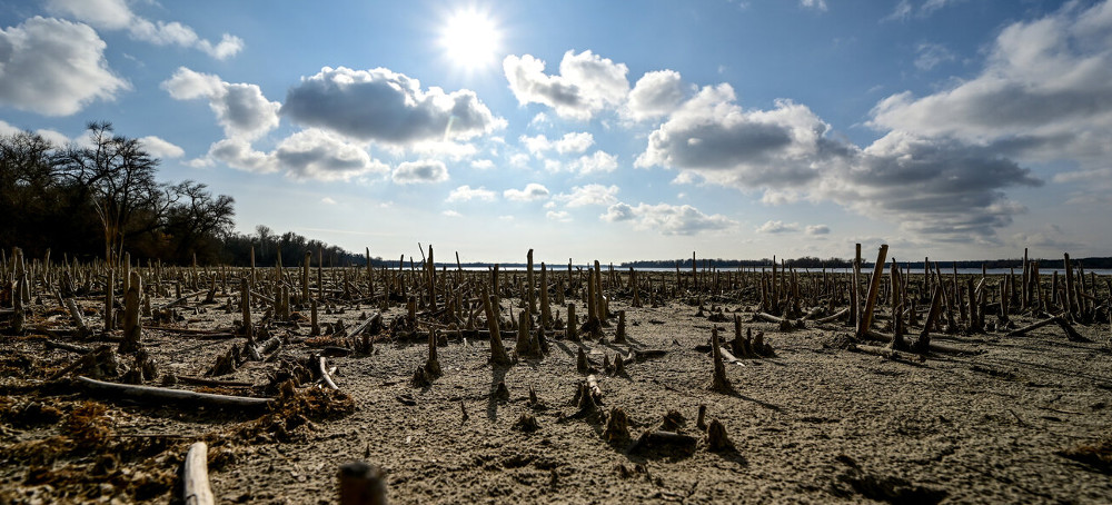 Aquatic plants and debris are exposed by the falling water levels at the Kakhovka Reservoir. Researchers say that the draining of the reservoir by Russian forces are but one example of the war's effect on Ukraine's water supply. (photo: Dmytro Smoliyenko/Ukrinform)