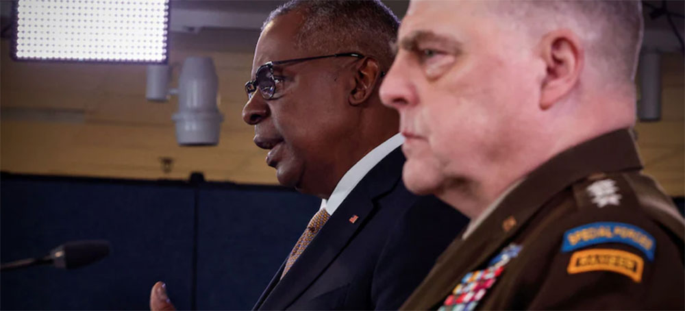 U.S. Defense Secretary Lloyd Austin and U.S. Chairman of the Joint Chiefs of Staff Gen. Mark A. Milley hold a news conference following a virtual Ukraine Defense Contact Group meeting at the Pentagon on March 15, 2023. (photo: Evelyn Hockstein/Reuters)