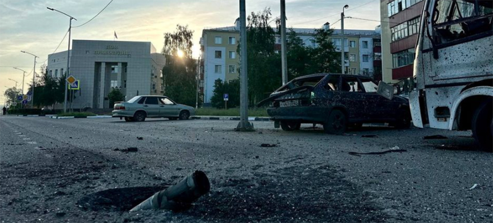 A view shows ammunition casing in a damaged street following what was said to be Ukrainian forces' shelling in the course of Russia-Ukraine conflict in the town of Shebekino in the Belgorod region, in this handout image released May 31, 2023. (photo: Governor of Russia's Belgorod Region Vyacheslav Gladkov/Telegram)
