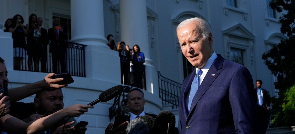 President Joe Biden talks with reporters before boarding Marine One on the South Lawn of the White House in Washington, May 26, 2023. (photo: Susan Walsh/AP)