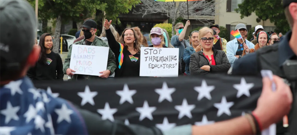 Protestors outside a Glendale Unified School District meeting on teaching sexual identity to kids in Glendale, California on June 6, 2023. (photo: Allen J. Schaben/LA Times)