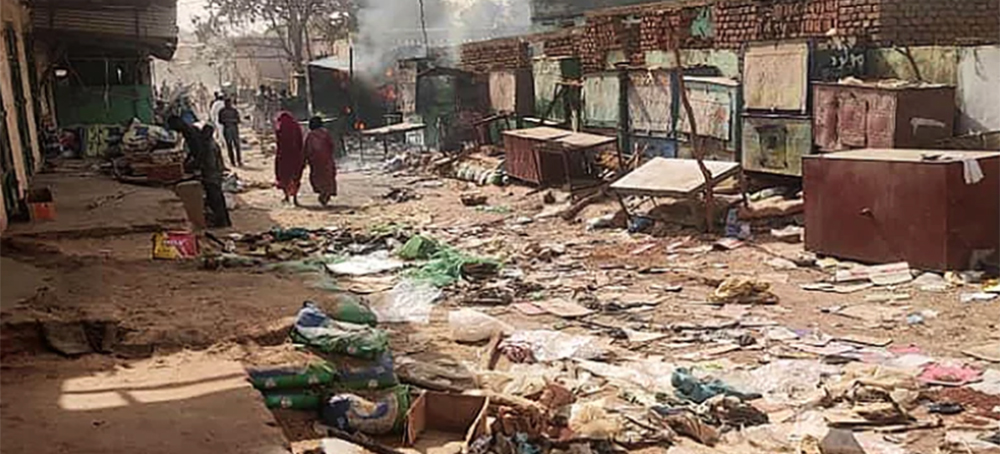 People walk among scattered objects in the market of El Geneina, the capital of West Darfur, as fighting continues in Sudan between the forces of two rival generals, on April 29, 2023. (photo: AFP)