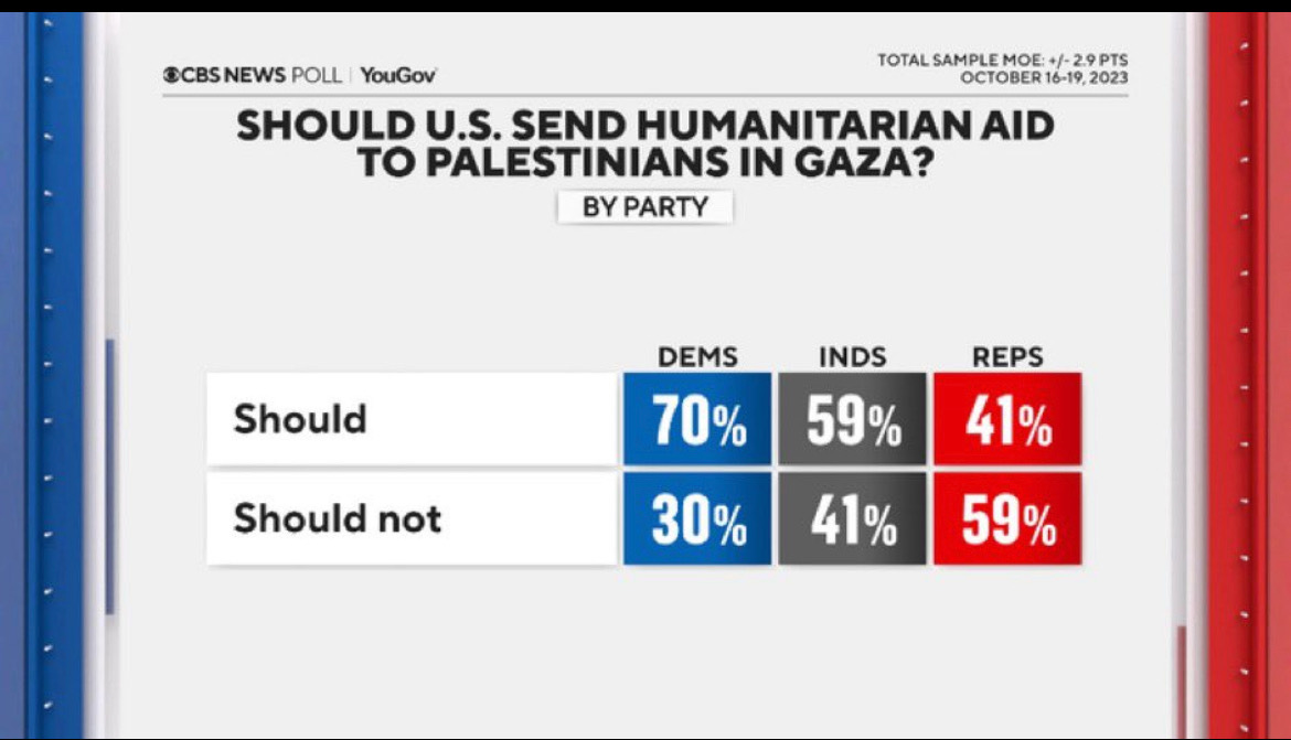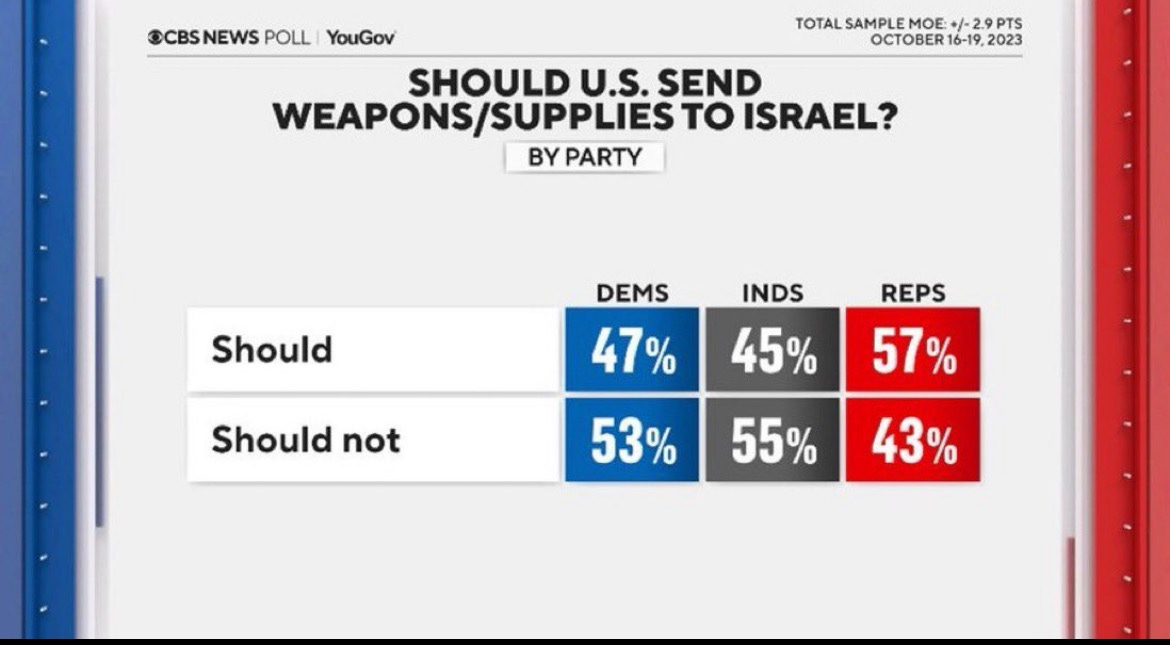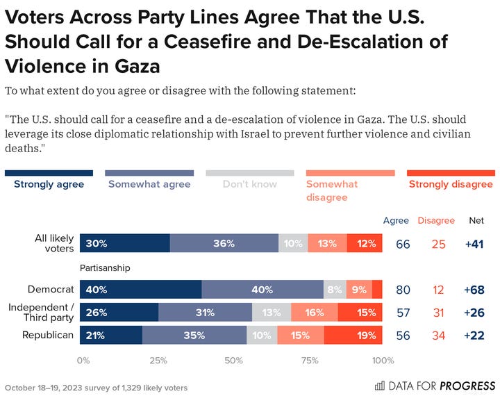 The vast majority of the American public agrees with this. Two separate polls in the past few days, one from CBS News, the other from Data for Progress, show that up to two-thirds of likely voters agree that the U.S. should be calling for a ceasefire, and the majority oppose increased military aide to Israel and favor immediate humanitarian aide to the Palestinians.