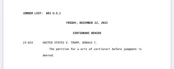This afternoon, the Supreme Court declined Jack Smith’s request to hear Trump’s appeal on presidential immunity, bypassing the court of appeals. Trump’s immunity motion is important because if he wins, it’s game over. The entire indictment would get dismissed if he were immune from prosecution. And while my assessment is in line with Judge Chutkan’s—she denied Trump’s motion—we don’t know for certain what the Supreme Court will do.