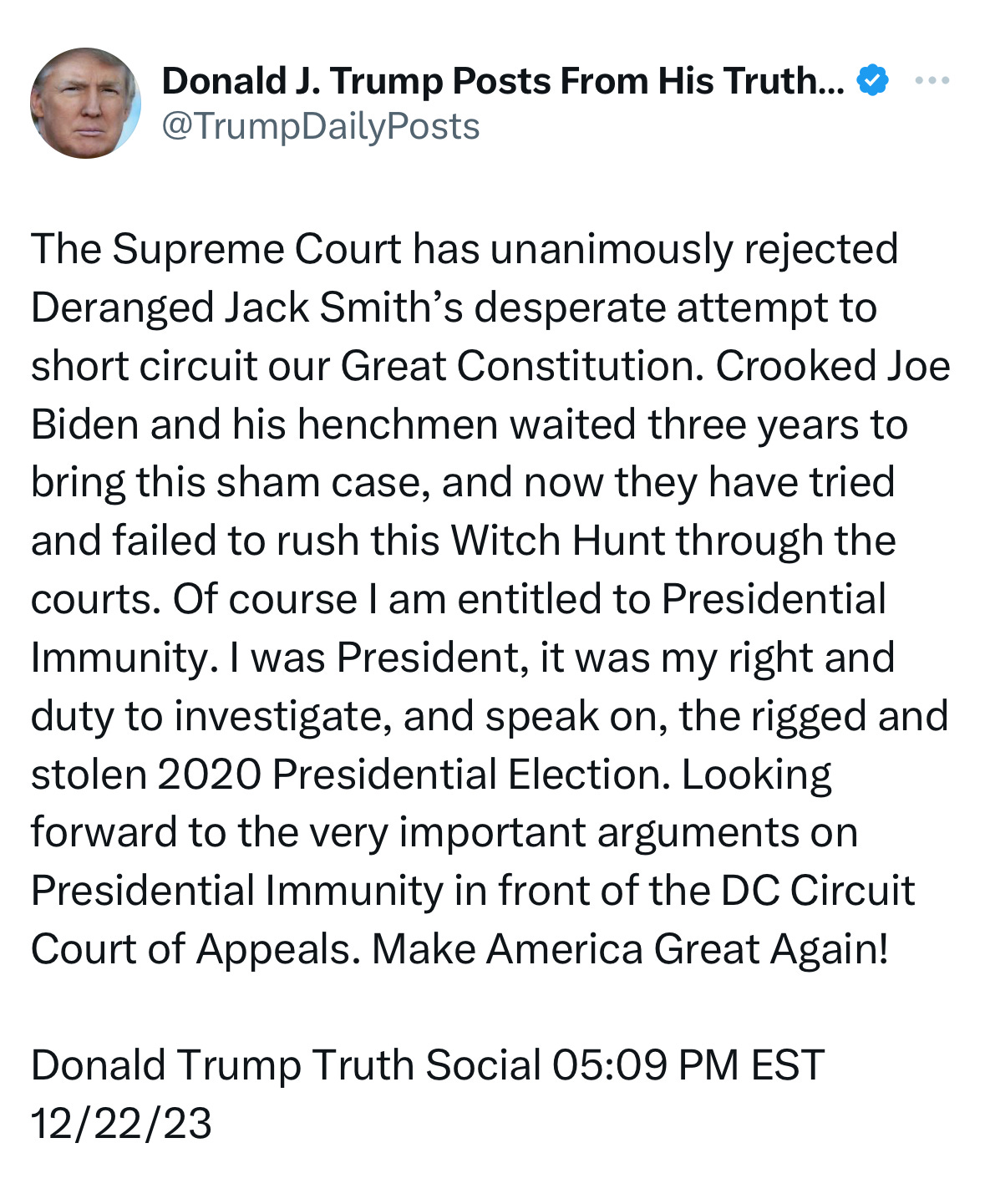 First, Trump claims the Supreme Court has “unanimously rejected Deranged Jack Smith’s desperate attempt to short circuit our Great Constitution.” Leaving the persistent errors in capitalization to the side, Smith isn’t trying to “short circuit” the Constitution—he asked for an established writ that has been used in other cases of similar magnitude to send an appeal directly to the Supreme Court. Nor has the Court unanimously rejected the underlying issue, Judge Chutkan’s denial of Trump presidential immunity motion. That substantive issue is still to be decided.