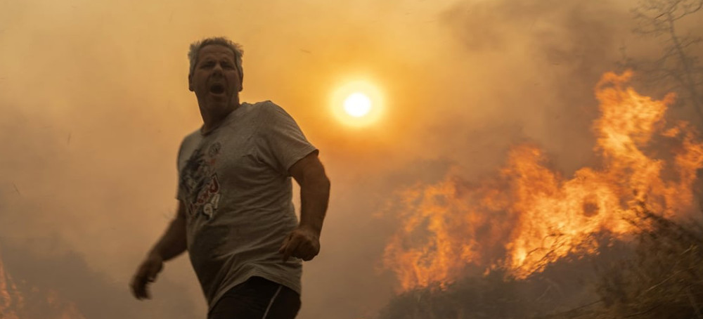 A local reacts as the flames burn trees in Gennadi village on the Greek island of Rhodes on Tuesday. (photo: AP)