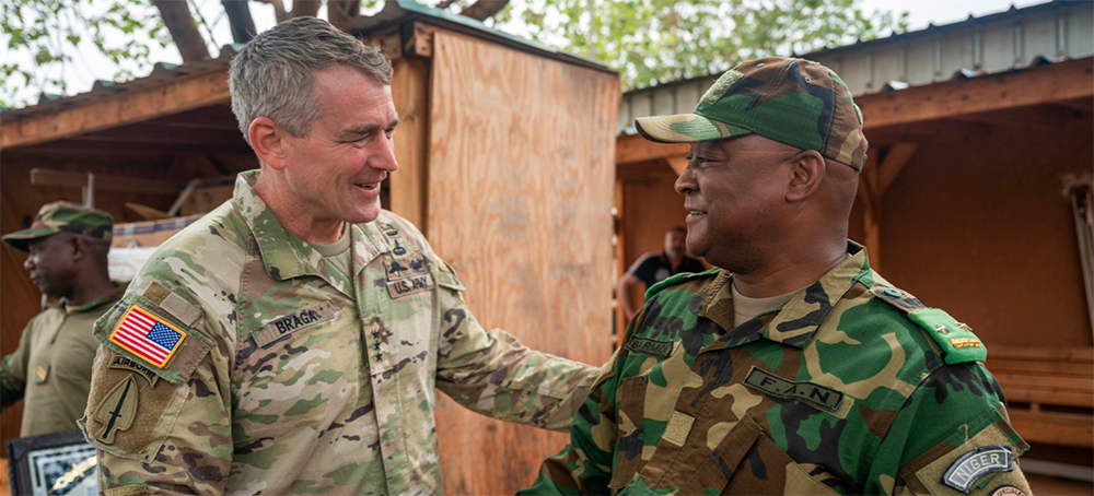 Lt. Gen. Johnathan Braga, U.S. Army Special Operations commander, meets with Brig. Gen. Moussa Barmou, Niger Special Operations Forces commander, at Air Base 101, in Niger, on June 12, 2023. (photo: Staff Sgt. Amy Younger/US Air Force)