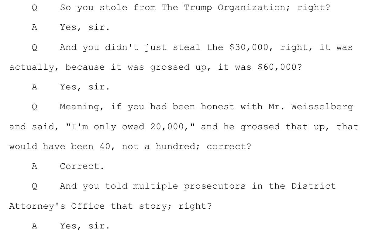 Blanche had asked Cohen questions about something he had already disclosed on direct examination: that while the full Trump debt to Red Finch was $50,000, Cohen had only paid them $20,000 at that time. Blanche had asked Cohen if he stole from the Trump Organization and Cohen agreed he had, saying he was angry that his annual bonus of $150,000 had been reduced to $50,000 the year Trump went to the White House.