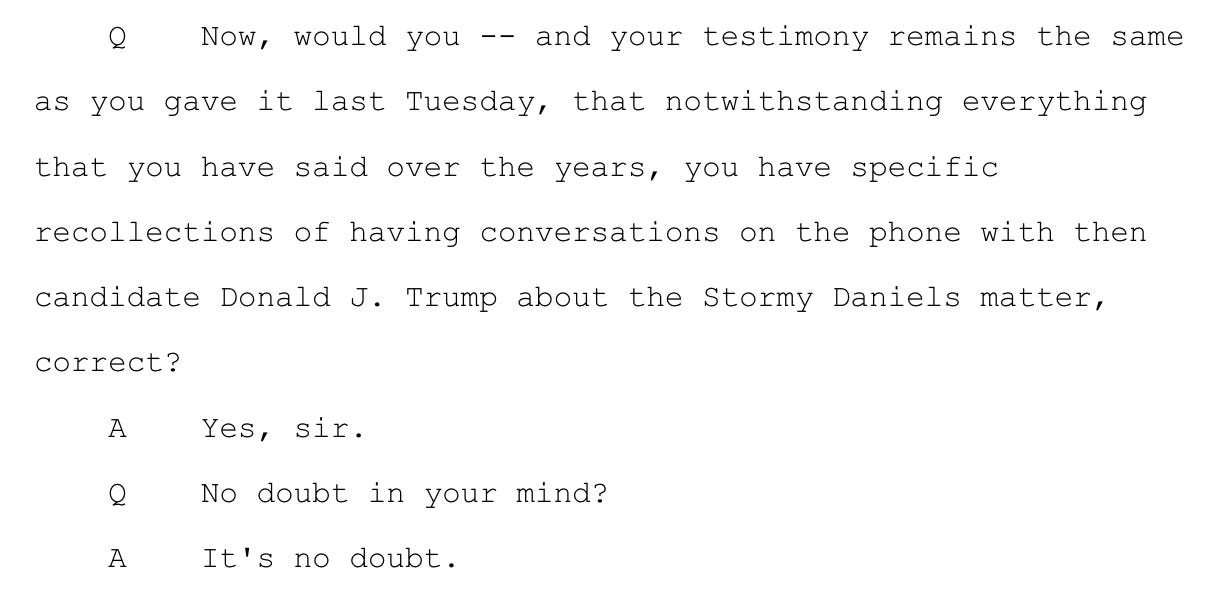 Blanche ended by asking Cohen if it was true that he would lie out of loyalty. Cohen said it was. Then Blanche curiously underscored one of the important moments in Cohen’s testimony that he had worked so hard to undercut, giving Cohen the opportunity to reaffirm his specific recollection that he had conversations with Trump on the phone about Stormy Daniels.