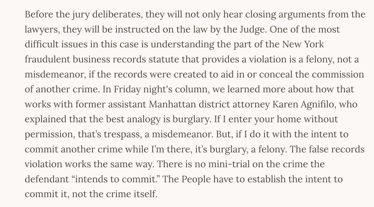 We discussed this last night in “The Week Ahead” edition of Civil Discourse, and the Judge confirmed what I wrote. Prosecutors must prove Trump intended to commit or conceal one of the other crimes, campaign finance or tax violation, not that he committed them. I wrote last night: