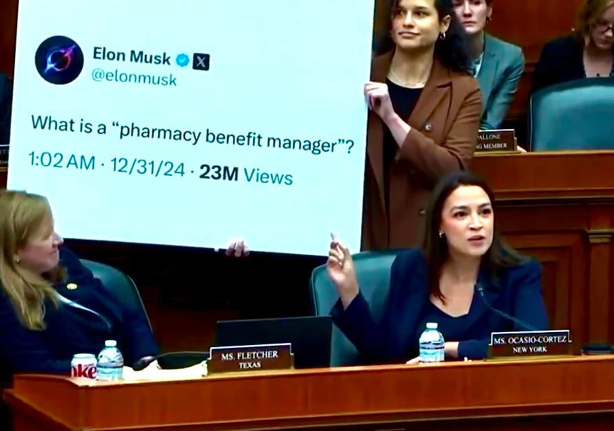 … AOC says she had near unanimous bipartisan support for one of her bills until Elon Musk got involved: “Why isn’t this moving? Republicans support it. Democrats support it. So what happened? On Dec 15th at 4:15 AM, Musk began firing off a barrage of social media posts opposing Pharmacy Benefit Manager reform. All of a sudden, something that had almost unanimous support fell apart. We had nearly 435 members on board with it—he tweets, and it kills drug pricing reform that would save people money on their insulin, asthma inhalers, and everything they need.