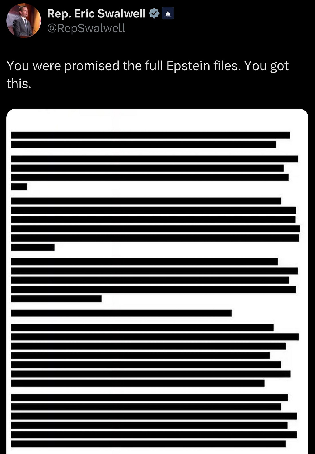 … Rep. Luna wasn’t happy: “Neither I nor the task force were given or reviewed the Epstein documents being released today. A NY Post story just revealed that the documents will simply be Epstein's phonebook. THIS IS NOT WHAT WE OR THE AMERICAN PEOPLE ASKED FOR and a complete disappointment. GET US THE INFORMATION WE ASKED FOR!”