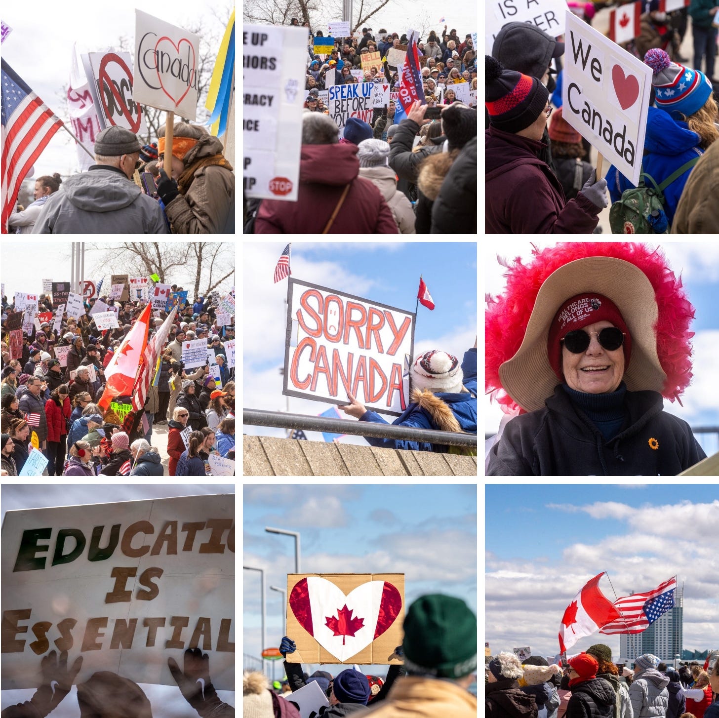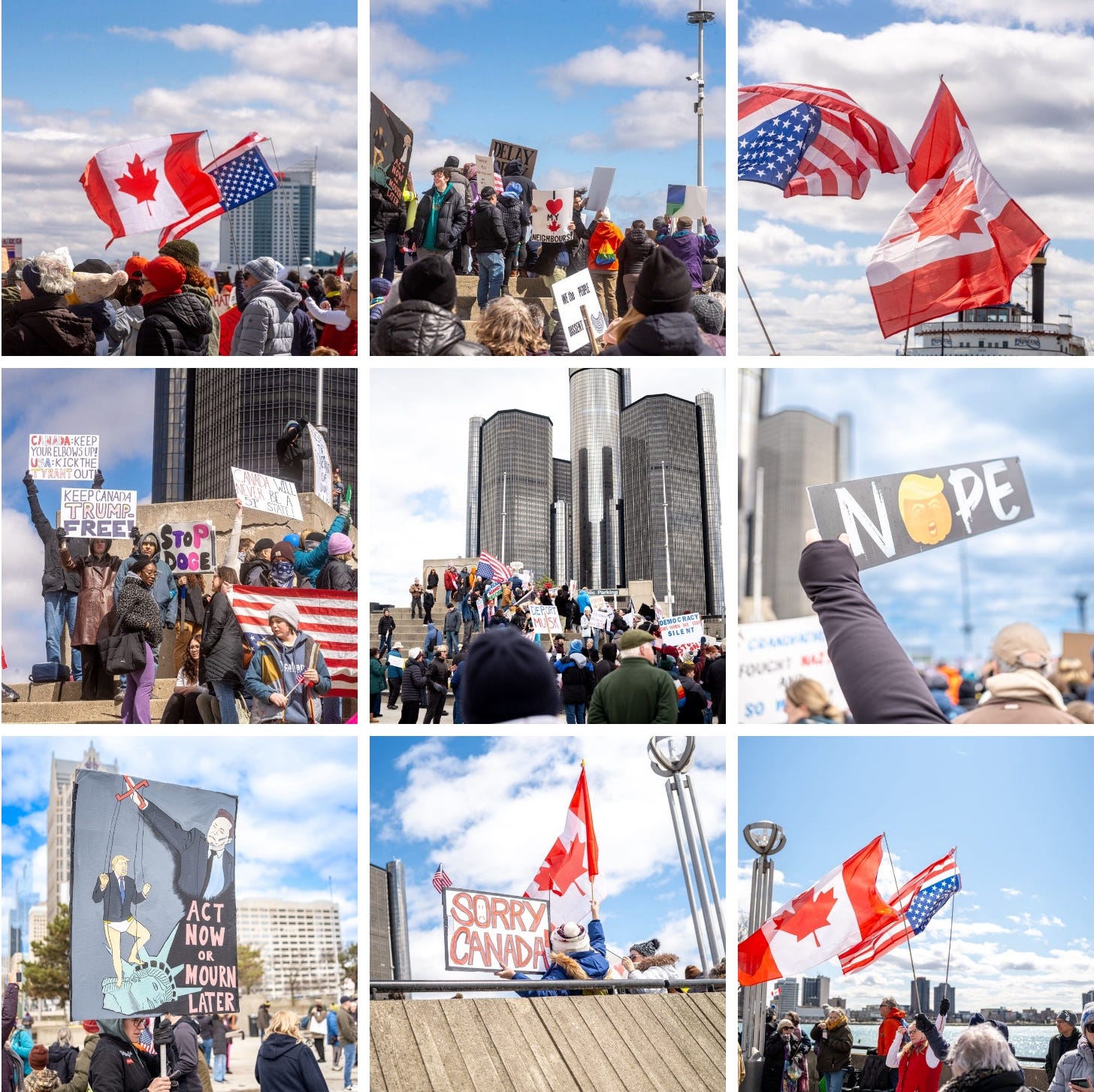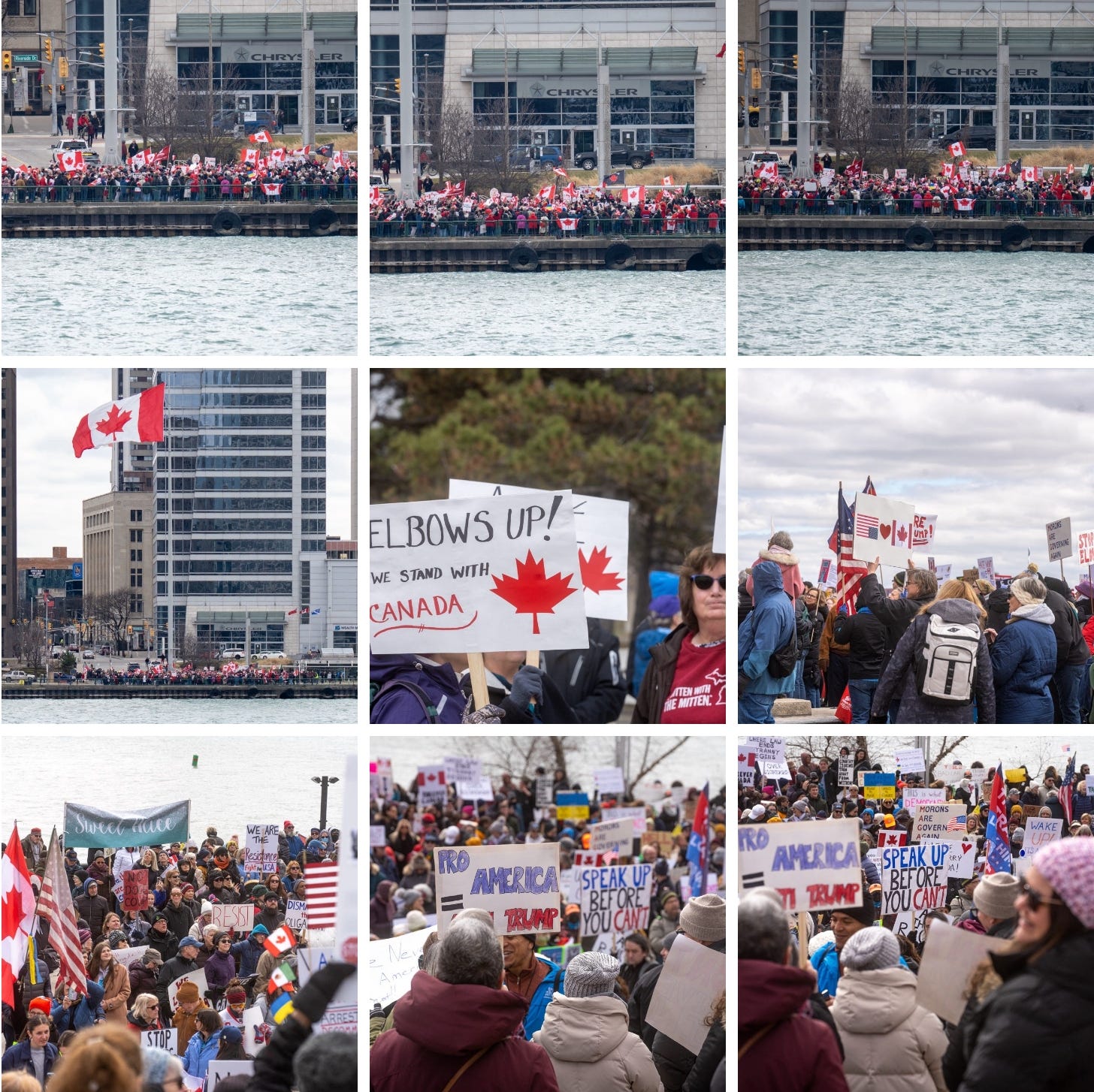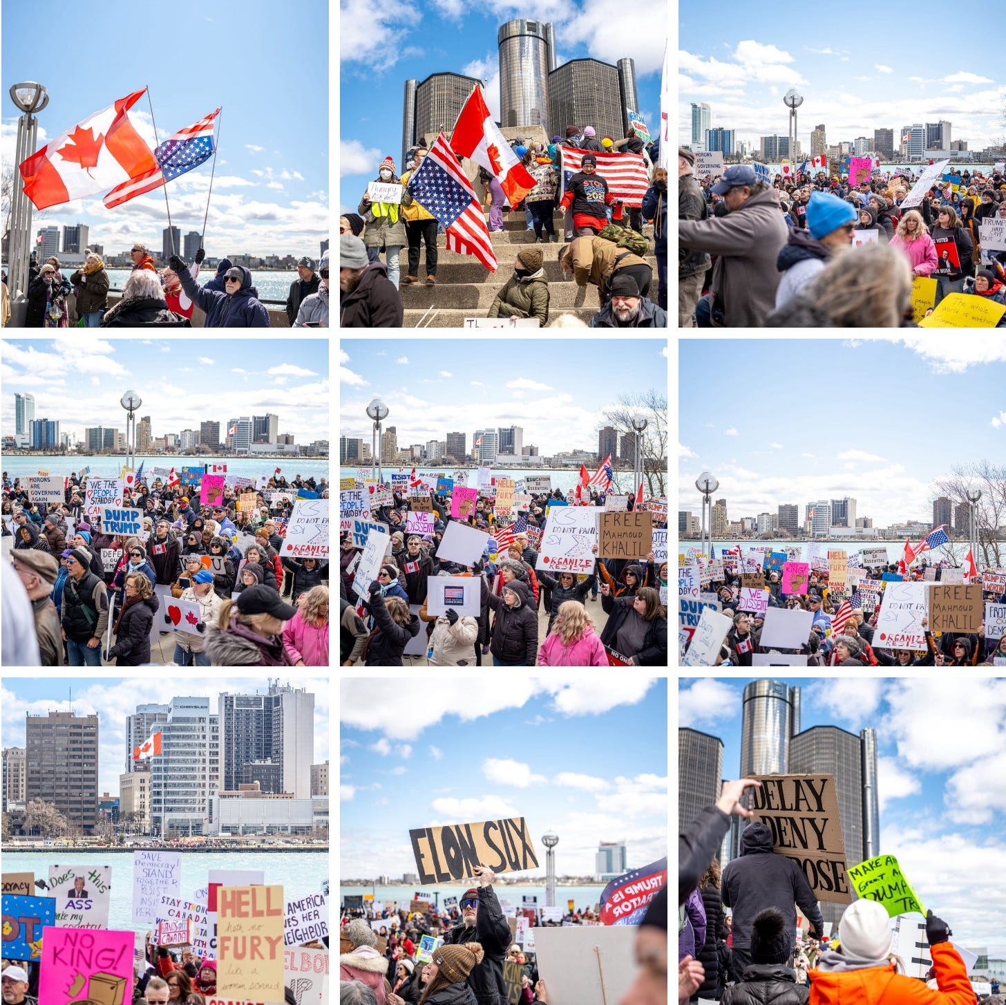 Below are some incredible photographs from today’s “We Dissent” protests in Detroit, Michigan and Windsor, Ontario. The protest against the Trump and Musk regime also highlighted the unity of the people in the United States and Canada who stand in solidarity with each other and against the authoritarian regime in the United States.