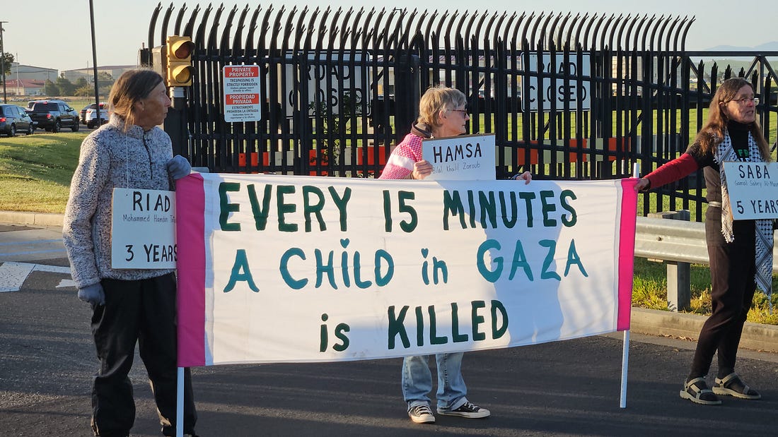 They each wore placards around their necks with the names and the ages of Palestinian children killed — a 1 year old, a 3 year old and a 5 year old, each one murdered by our weapons and our money.