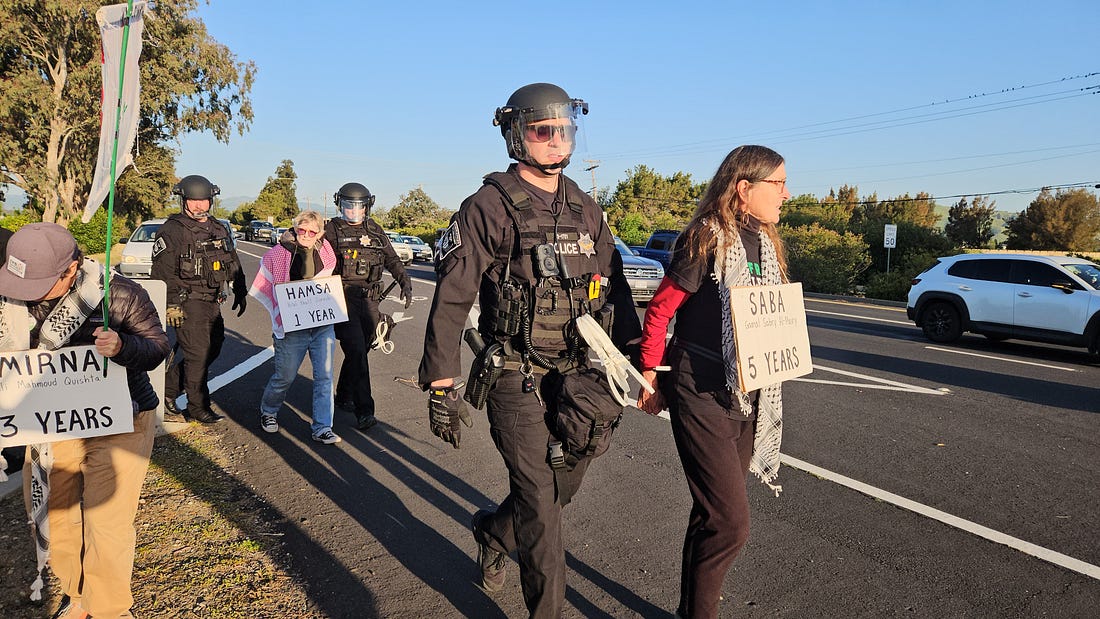 In California this week, dozens of people formed a human chain blocking the entrance to the Travis Air Force base. They were protesting the American military’s continued role in the genocidal slaughter of the Palestinian people, and they were also protesting the use of American military planes to facilitate Donald Trump’s wrongful and illegal mass deportations of immigrants. Twelve of the protestors were arrested, including these 3 women in the photo below, two of them grandmothers, after they bravely refused to stop blocking the entrance to the Air Force base.