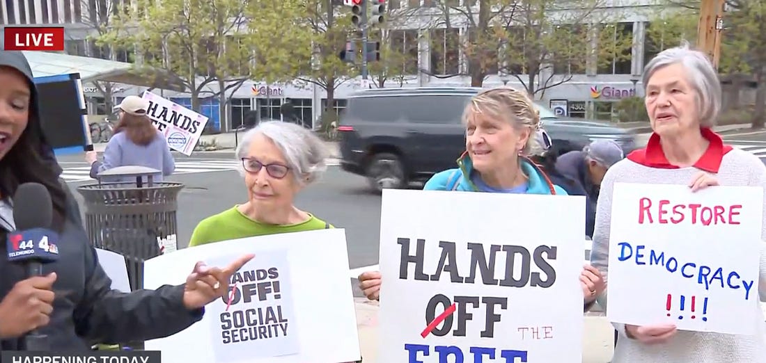 The Week AheadApril 6, 2025On Saturday, Max Flugrath at Fair Fight, the pro-voting organization started by Stacey Abrams, tweeted: “What do @CoryBooker's 25-hour protest speech, wins in Wisconsin and Louisiana, and 1,100+ rallies today have in common? They’re all part of a growing movement to stop Trump & Elon Musk's attack on democracy.” With protests across the country and marchers in every state, there is no doubt that many American citizens have awakened to what is going on with this administration. It’s no surprise that Trump demonized the idea of people being “woke” almost a decade ago. Paying attention to what’s going on is essential to holding onto democracy. It’s time to wear that label proudly again, and so many Americans did yesterday. A lot of you shared your comments and pictures from Saturday’s marches and rallies. One of my favorites was this one from a 92-year-old reader (in the green sweater) who sent a clip of her interview on NBC. I’ve enjoyed looking at all of them!