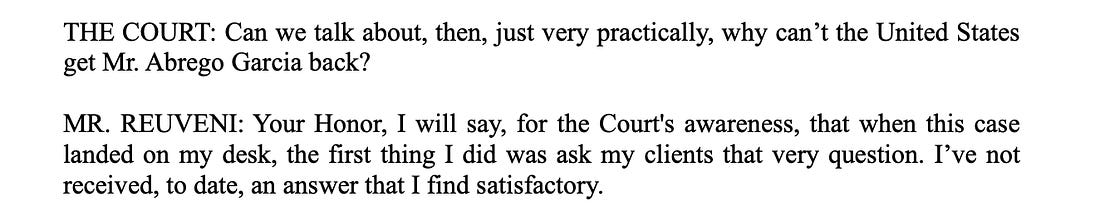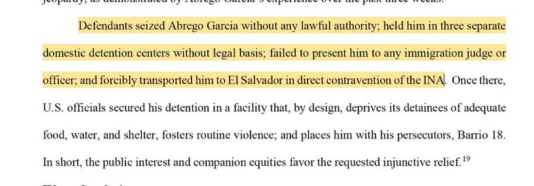 The Judge was not persuaded and ordered the government to return Abrego Garcia to the United States. She explained the background of the case, which involved Abrego Garcia’s family business in El Salvador, which she described as “a small and successful pupuseria,” a shop where a popular El Salvadoran dish consisting of thick corn tortillas with different kinds of fillings like cheese, beans, and pork is sold. The family business was extorted, including by death threats, for many years by a notorious gang, Barrio 18. The Judge writes, “The gang used Abrego Garcia as a pawn in its extortion, demanding that his mother give Abrego Garcia over to the gang or he and others in their family would be killed. Attempting to escape the gang’s reach, the family moved three times without success. To protect Abrego Garcia, they ultimately sent him to the United States to live with his older brother, a U.S. citizen, in Maryland.” Abrego Garcia was working as a day laborer when he was arrested and turned over to ICE. DHS asked the immigration judge to keep him in detention after he conceded he was deportable but asked for asylum. Judge Xinis explained that the request was based on alleged gang membership, but “DHS relied principally on a singular unsubstantiated allegation that Abrego Garcia was a member of MS-13.5.” In a footnote, she explained that “The ‘evidence’ against Abrego Garcia consisted of nothing more than his Chicago Bulls hat and hoodie, and a vague, uncorroborated allegation from a confidential informant claiming he belonged to MS-13’s ‘Western’ clique in New York—a place he has never lived.” It’s important to understand that when the government refers to Abrego Garcia as a violent gang member, this is the quality of the evidence that backs that claim up. You may recall that when we discussed this case last week, I wrote that, “Press Secretary Karoline Leavitt claimed today that there was ‘a lot of evidence’ Abrego Garcia was a convicted member of the gang MS-13, saying that ‘I saw it this morning.’” On October 10, 2019—during the Trump administration—Abrego Garcia was granted “withholding of removal to El Salvador.” That doesn’t forgive the fact that he was here illegally and was subject to deportation, but rather, an order of that nature reflects the higher principle that we are not a country that returns people to other countries where they are going to face persecution. The immigration judge granted the protection because the Barrio 18 gang had been “targeting him and threatening him with death because of his family’s pupusa business.” DHS never appealed that decision and the order became final. The court notes that Abrego Garcia remained in Maryland with his wife and three children for the next six years and “complied fully with all directives from ICE, including annual check-ins, and has never been charged with or convicted of any crime.” In other words, the Trump administration lied about who he is. He may not be here legally, but he’s not a violent criminal, and U.S. law, which went unchallenged by the first Trump administration, protected him from being deported. There is no legal, or for that matter, factual or moral, justification for what the government did. Abrego Garcia was not, as we have previously noted, deported under the Alien Enemies Act. He was on the third planeload of people the Trump administration sent to El Salvador, claiming they were validly subject to deportation under what is known as a Title 8 removal order. The Judge explained his fate: After being taken off of the plane in El Salvador, he was stripped, shackled, shaved, and marched into a prison with “some of the most inhumane and squalid conditions known in any carceral system. Since then, no one has heard from Abrego Garcia.” If it can happen to Abrego Garcia, it can happen to any of us. He saw no judge before he was deported, had no opportunity to plead his case that what was happening to him wasn’t permitted. As the Judge noted, El Salvador’s President, Nayib Bukele, has “publicly touted,” his agreement with the United States is to “take in only convicted criminals” and that includes U.S. citizens. Interestingly, Bukele noted that he had returned seven female detainees because the prison is only for men. No word on why they took someone (and likely far more than one person), who was not a “convicted criminal.” There is no doubt that many, if not most, of the people the government has sent to El Salvador are “deportable,” but that’s not the same as sending them to a terror prison for the rest of their lives. It still shocks me that detail hasn’t garnered more attention. Whatever the fate of other prisoners, the Judge reached the conclusion that “Abrego Garcia’s case is categorically different—there were no legal grounds whatsoever for his arrest, detention, or removal. Nor does any evidence suggest that Abrego Garcia is being held in CECOT at the behest of Salvadoran authorities to answer for crimes in that country. Rather, his detention appears wholly lawless.” Wholly lawless just about sums up this administration so far. You would expect the government, if this were a normal administration, which it most assuredly isn’t, to confess error and voluntarily return Abrego Garcia. But that has not been the case. The Judge rejected the government’s argument that it could not retrieve Abrego Garcia from prison in El Salvador, noting “Defendants can and do return wrongfully removed migrants as a matter of course.” And she noted that based on DHS Secretary Noem’s statement that the terror prison was one of the “tools” in the government’s toolkit for dealing with immigration detainees, “record reflects that Defendants have ‘outsource[d] part of the [United States’] prison system,” so the government still has power over their fate. “This is not about Defendants’ inability to return Ab