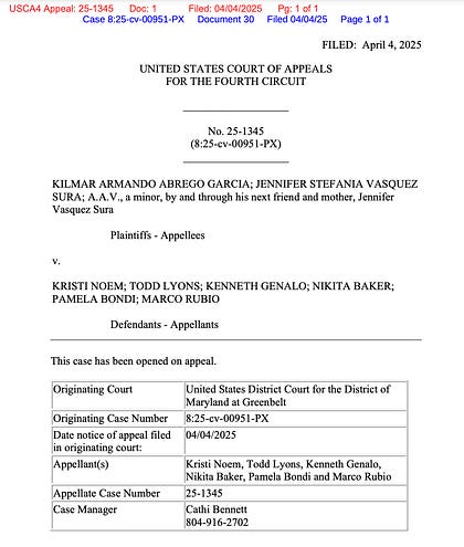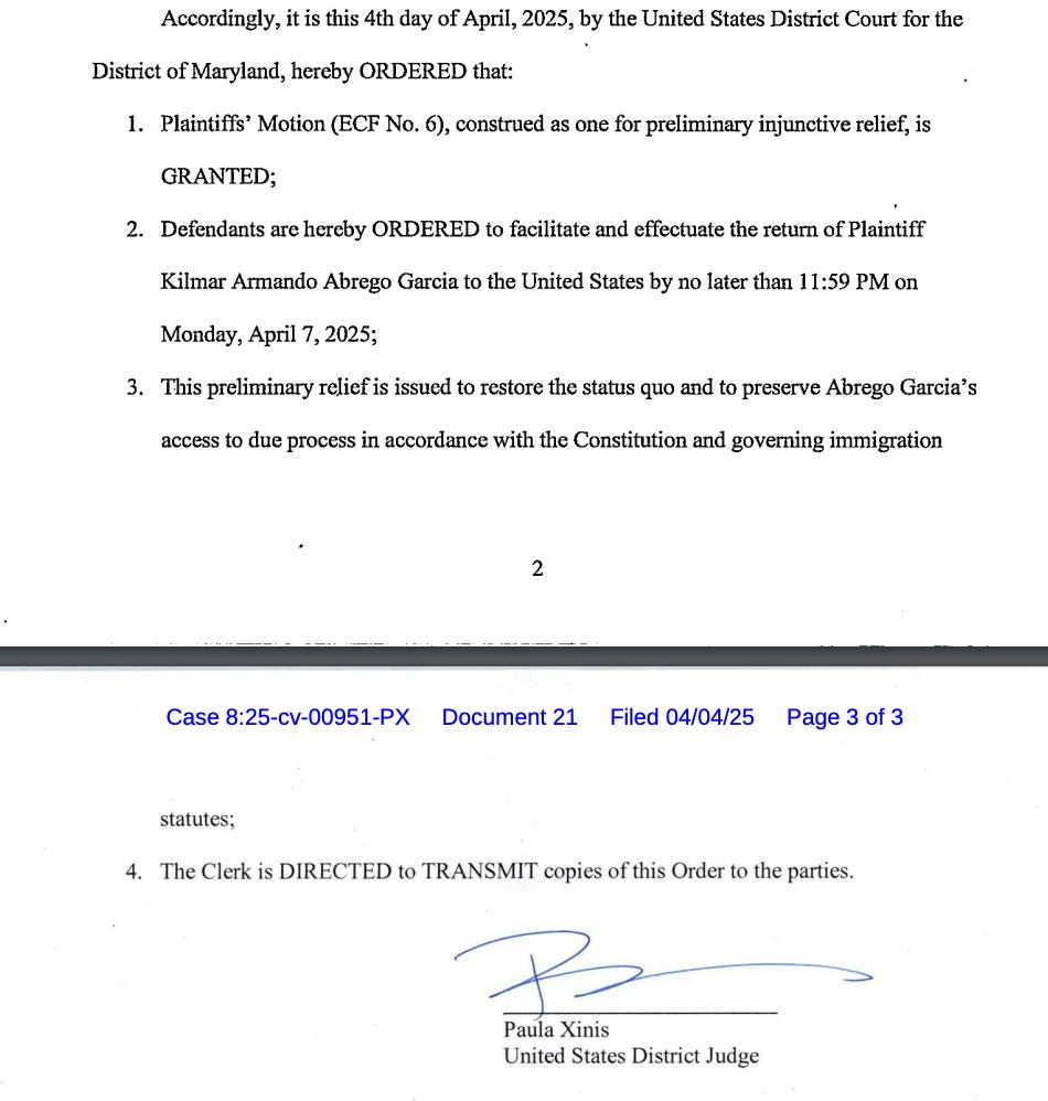 And from Seattle, part of our family of choice took the kids along to protest. I have no doubt there will be more. Despite how invigorating the weekend was, we still face serious issues in the week ahead. I apologize in advance for the long post, but I hope you’ll appreciate all of the information that will be important for this week that I’ve packed into it. The big question: having knocked the Congress into a supine position, at least temporarily, will the Trump administration try to make good on its threat to kick over the judiciary too? Or will it continue to obey, or at least go through the motions of obeying, court orders? It all comes to a head this week as Trump tries to stay true to his promise of mass deportations, despite multiple cases of mistakes and arrests of students, not the hardened criminals he promised to remove from our communities. Will the government return a Maryland man improperly deported to El Salvador? A federal judge gave them until Monday to do so. The Department asked Judge Paula Xinis to pause her order, but she declined to do so. Sunday morning, she issued a ruling that confirmed her judgment from Friday and castigated the Justice Department for its conduct. Tonight, I want to spend our time together discussing her written opinion in detail, because it is by turns shocking (yes, that’s still possible) and informative, and it’s important for us to understand the specifics. The Judge summarized the facts of the case: “In 2019, an immigration judge … granted Plaintiff Kilmar Armando Abrego Garcia (“Abrego Garcia”) withholding of removal, thereby protecting him from return to his native country, El Salvador … Such protection bars the United States from sending a noncitizen to a country where, more likely than not, he would face persecution that risks his “life or freedom.” … Six years later, without notice, legal justification, or due process, officers from U.S. Immigration and Customs Enforcement (“ICE”), a subagency of the Department of Homeland Security (“DHS”), put him on a plane bound for the Terrorism Confinement Center (“CECOT”) in El Salvador … Neither the United States nor El Salvador have told anyone why he was returned to the very country to which he cannot return, or why he is detained at CECOT.” In her order, Judge Xinis remarked on an exchange during the hearing, where the lawyer representing the Justice Department was forced to concede, “We have nothing to say on the merits. We concede he should not have been removed to El Salvador.” When the Judge asked what the basis for holding Abrego Gracia in the CECOT was, he responded, “I don’t know. That information has not been given to me. I don’t know.” In the hearing, the government’s position was: