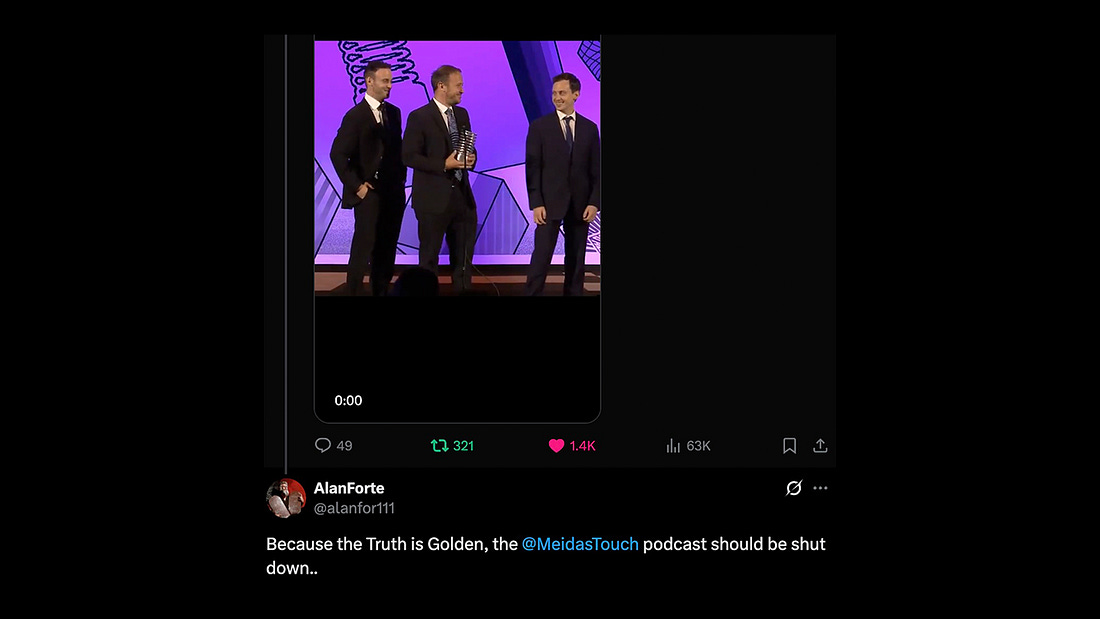 By Ben Meiselas Hey Meidas Mighty. It’s like clockwork with Trumpers and MAGA. After we hit a major milestone or big win, they attack us and call on their dear leader to try and shut us down. Following the announcement by the Webbys that the MeidasTouch Podcast won Podcast of the Year, we were hit with more attacks and calls by Trumpers to shut us down. We were also targeted by an account on this Substack that tried to steal our identity and harass our supporters here. Thank you to everyone who brought this to our attention so we could report and ban that offending account immediately. It also seems that during our live shows, the trolls and harassers have picked up in a coordinated effort since the Webby win. A special thanks to our moderators for banning all these accounts that try to interfere with the viewing experience. We appreciate your help so much. I’ve only been working off a few hours of sleep since I’ve been in New York, so I hope you don’t mind if I keep this post short. I want to thank you all for having our back throughout all of this. This is a fight we must win—and will win—together against Trump and his fascist regime. Your subscriptions to this Substack have allowed us to become the most viewed news channel on YouTube and the most downloaded podcast in America (Remember to add the MeidasTouch Podcast on Apple Podcasts and Spotify). With the Webby Award, we expected to get more threats and attacks, and as Kurt Vonnegut said, “and so it goes.” To anyone who hasn’t yet subscribed to this Substack, we need your help more than ever. Please subscribe today. Our Editor-in-Chief Ron Filipkowski writes the best and most comprehensive daily bulletins out there. We post the top exclusive interviews here with Democratic leaders. And most importantly, subscribing helps the MeidasTouch Network grow and allows us to continue beating Fox and all right-wing podcasts combined. So please subscribe now if you can and help MeidasTouch independent reporting grow. |
