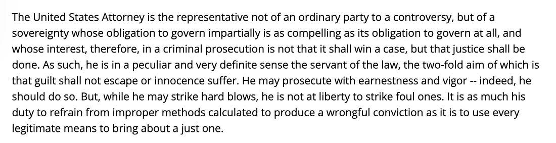 Then there is also the defense of vindictive/selective prosecution, which can get a conviction reversed. That’s usually a tough hill to climb, as we saw in the Hunter Biden prosecution, but Martin is a defense lawyer’s best friend in this regard. For instance, after reaching out—on Twitter—to express his support for Elon Musk and DOGE, he then suggested he’d prosecute anyone who got in their way. His negative comments about Democrats would taint any prosecution. Courts look harshly on prosecutors who engage in this kind of behavior. As Justice Sutherland wrote in a 1935 opinion, while a prosecutor “may strike hard blows, he is not at liberty to strike foul ones.”