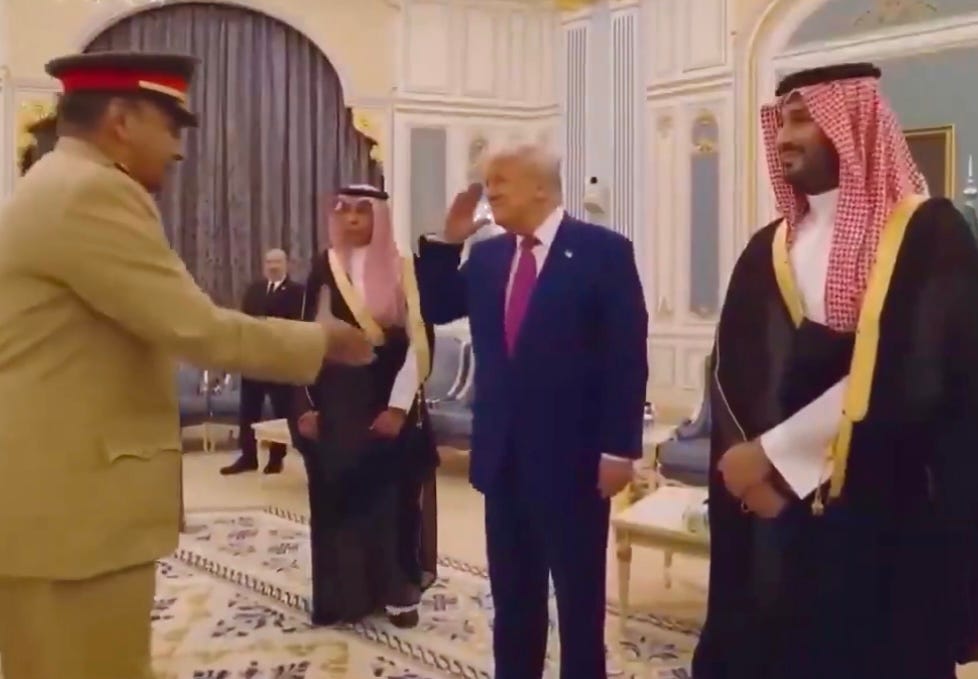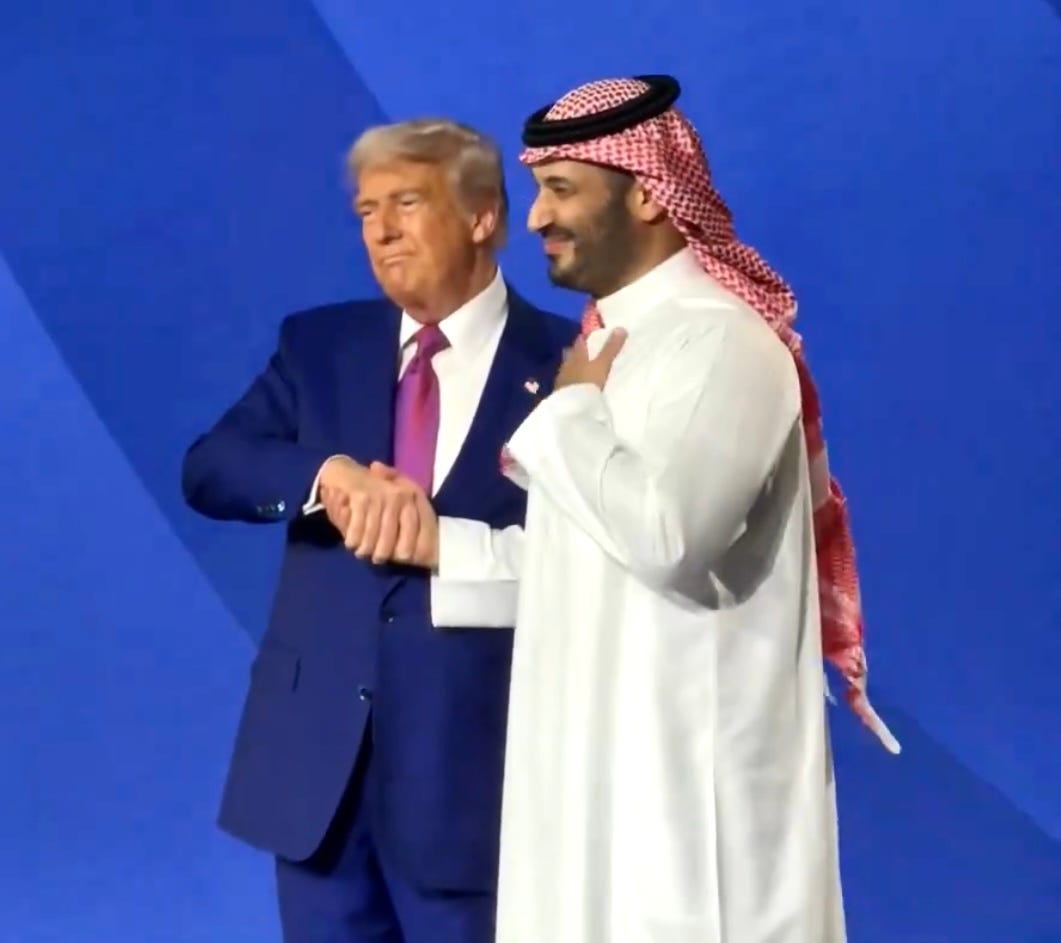 … One day after Syrian President Ahmed al-Sharaa offered to build a Trump Tower Damascus as a sweetener to persuade Trump to meet with him during his Middle East trip to discuss the US lifting sanctions on his country, Trump announced he was lifting sanctions. He said it will “give them a chance at greatness” and claimed he was only doing it as a favor to Saudi Arabia’s MBS: "Oh, the things I do for the Crown Prince." … While we don’t know whether Trump’s motives involved bribery and self-interest (it usually does), many still believe it was the right decision. Former CIA agent Marc Polymeropoulos: “There must be a hell of a backstory on this, as I assumed his national security team, particularly those in the NSC, was against such moves. Also - the Israelis are not gonna be very happy. My take as someone who worked on Syria for many years, this the right move.” … Noah Rothman of conservative National Review says that Trump’s decision here probably goes against the wishes of his Assad-fan DNI Tulsi Gabbard: “In case you need a primer on the dispute within the admin over how to approach post-Assad Syria - looks like the Tulsi faction is on the outs.” … Oz Katerji, Director of The Battle for Kyiv: “If a proscribed paramilitary organization wins a civil war, disarms, renounces terrorism, and bans terrorist activity on the territory it now governs, it becomes perfectly possible to become deproscribed.” … In his speech, Trump praised MBS: “I want to thank his royal highness the Crown Prince. He's an incredible man. I've known him a long time now. There's nobody like him. Appreciate it very much, my friend. We have great partners in the world, but we have none stronger and nobody like the gentleman right before me. He's your greatest representative. And if I didn't like him, I'd get out of here so fast. He knows me well. I like him a lot. I like him too much." … He then praised himself to his mostly-Saudi audience, claiming that he just saved the American health care system with his executive order on prescription drugs: "You saw what we did yesterday in healthcare. We've cut our healthcare by 50-90%." … Then he saluted Saudi Arabian generals. … WH Correspondent’s Assn: “For the first time since the WH press corps started traveling with American presidents abroad, no wire service reporter is aboard Air Force One today. As the president travels across the ocean for high-stakes meetings in the Middle East, the White House has decided not in include any wire reporter. The WHCA is disturbed by this new restriction on who can cover this WH and continued retaliation for independent editorial decisions.” … WH Communications Director Steve Cheung responded: “Oh no! Not a strongly worded email!” … Sen. Thom Tillis (R-NC) was critical of Trump’s executive order on pharmaceuticals in a committee hearing today: “The ‘most favored nation’ approach coming out of the admin - all of these other things, are short-sighted, unsustainable measures that are not going to produce the result I believe all of us want to achieve.” … Sen. Maj. Leader John Thune to HuffPost: “My guess is that it'll be the subject of probably multiple lawsuits, and I think the courts will probably have something to say about it.” … Lots of Republicans were asked about Trump’s ‘Palace in the Sky’ Qatari plane grift today with very different takes. Rep. Rich McCormick (R-GA) on CNN: “This is just an offer of friendship, but I’m sure this has to be legal if we are going to accept it. If it’s unethical, that will be up to the president to decide.” … Sen. Markwayne Mullin (R-OK) to CNN: “I have zero issue with it.” … Sen. Steve Daines (R-MT): “You can’t beat free!” … Sen. Rick Scott (R-FL): “I worry about the president of the United States flying on any plane owned by a foreign government, especially a foreign government that supports Hamas." … Rep. Ryan Zinke (R-MT): "It must be one heck of a jet. I understand it went through AG Pam Bondi. So it's legal. It's ethical." … Sen. Lisa Murkowski (R-AK): “How many of us have actually been offered the promise of a jet? When you get something of that value from a country, one typically thinks that there's something in it for the country that is offering it.” … Sen. Rand Paul (R-KY) on Fox: “The constitution in Article 2 says the president cannot take gifts from foreign leaders. There is a provision in the Constitution that says you cannot do this. I think it’s not worth the appearance of impropriety.” … Sen. Ted Cruz (R-TX) on CNBC: "I think the plane poses significant espionage and surveillance problems. I certainly have concerns." …. Rep. Mike Lawler (R-NY) on CNBC: "We don't want to be straight up accepting any type of gift from any foreign government, certainly not one that can be viewed in a way that obviously has been presented here." … Rep. Dusty Johnson (R-SD) on CNN: "I don't like it. There's a reason that people can't even buy me a steak dinner. It's not necessarily that you can prove I have an ethical problem, it's that the appearance of it doesn't look great." … Sen. Chris Coons (D-DE) on Fox: “Would we let another country decorate the Oval Office? Would we let another country build the Situation Room? Would we let another country wire the press office? Oh, wait. Air Force One is all three. Air Force One is the Oval Office. It's the press room. It's the situation room all in the air. Why on Earth is it a good idea from a national security perspective to let another country, let alone the Emir of another country, give President Trump his next Air Force One?” … Nikki Haley: “Accepting gifts from foreign nations is never a good practice. It threatens intelligence and national security. Especially when that nation supports a terrorist organization and allows those terrorist regimes to live on its soil. Regardless of how beautiful the plane may be, it opens a