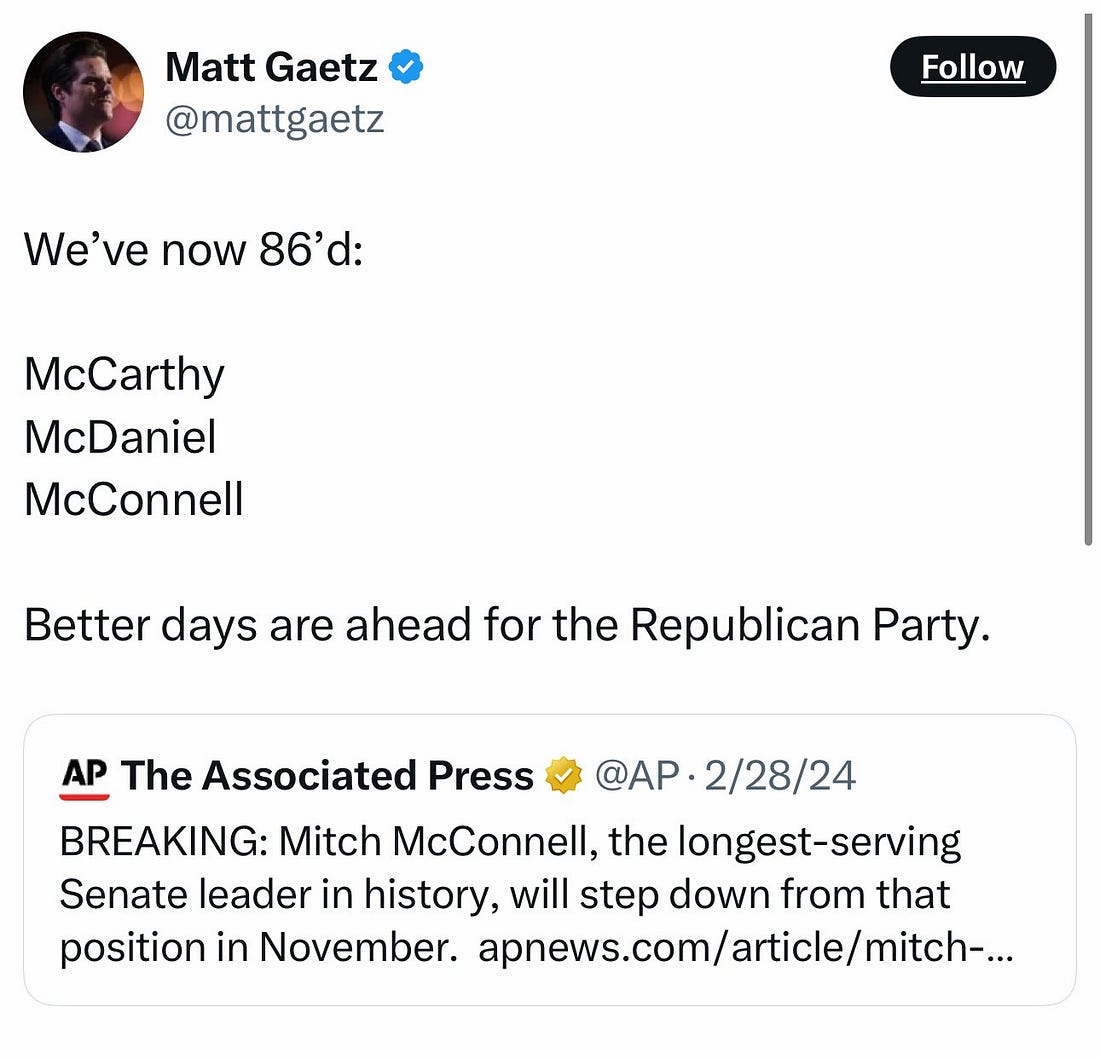 … Politico’s Meredith Lee Hill: “A brutal week for Hill Republicans: 1. Bond market chaos. 2. Failed Trump megabill vote. 3. Moody’s downgrades US credit rating.” … The Supreme Court ruled today that Trump must halt deportations of alleged gang members without due process by a 7-2 vote. Thomas and Alito dissented. … Trump responded on Truth Social with an all-caps rant: “THE SUPREME COURT WON’T ALLOW US TO GET CRIMINALS OUT OF OUR COUNTRY!” … Sen. Mike Lee (R-UT): “SCOTUS extends deportation block. Do seven of our nine justices really want to Make Aliens Terrorists Welcome Again? Do American voters get no say in this?” … Rep. Mike Collins (R-GA): “So it’s legal for a president to ship millions of illegal aliens into our country but it’s illegal to send them home? The system is broken. The Supreme Court failed us. Whose country is this anymore?” … Trump and senior members of his admin continue to call for the arrest and imprisonment of former FBI Director James Comey after he posted a photo of sea shells on the beach in the shape of the numbers “86 47”. They claim that “86” in this context means “assassinate”, and Comey is sending out a code to operatives to take out Trump. … FBI Director Kash Patel: “We are aware of the recent social media post by former FBI Director James Comey, directed at President Trump. We are in communication with the Secret Service and Director Curran. Primary jurisdiction is with SS on these matters and we, the FBI, will provide all necessary support.” … DNI Tulsi Gabbard: “James Comey just issued a call to action to murder the President. As a former FBI Director and someone who spent most of his career prosecuting mobsters and gangsters, he knew exactly what he was doing and must be held accountable under the full force of the law. We fully support the Secret Service investigation into Comey’s threat on President Trump’s life.” … Stephen Miller: “As the former FBI director, and key leader of the deep state, Comey’s call for assassination — while the president is abroad no less — is a chilling escalation of the war against our democracy by a faction committed to its destruction.” … Trump: "He knew exactly what that meant - it meant assassination. It says it loud and clear - he's calling for the assassination of the president. It's gonna be up to Pam Bondi what happens. He's a dirty cop." … Speaker Mike Johnson: “President Trump has already survived TWO assassination attempts. Now, former disgraced FBI director James Comey is either threatening to kill Trump or suggesting someone should. This is as outrageous as it is dangerous. Grateful Secretary [DOG KILLER] Noem and FBI Director Patel are looking into this.” … Newsmax host Todd Starnes: “Did James Comey's beach message activate a sleeper cell? Is President Trump's life in danger? At the very least the Secret Service and FBI should've conducted a guns-drawn, pre-dawn raid on Comey's house. He should've been dragged onto his front lawn in handcuffs with CNN cameras pre-positioned in the bushes. His mug shot should've already been posted on national TV. The fact that Comey is not in jail this morning is yet another troubling sign that our 3-letter agencies are still controlled by the Deep State. Let's see what AG Bondi says on her hourly Fox News segments.” … Actor Randy ‘Cousin Eddie’ Quaid: “Get Comey’s fingerprints on the shells, (unless he was wearing gloves), but there should definitely be some drool that escaped from his mouth as he gathered shells and fashioned them to create his sinister message threatening Trump’s life, knowing it would go viral as a clandestine message for world agencies to see. Send a couple of guys over to arrest Comey and put him in a double-wide lock up in a corner of the prison yard for being a security risk to America!” LOONEY … Laura Loomer: “If Comey doesn’t get arrested and Pam Blondi doesn’t fire James Comey’s daughter from the DOJ, then you’ll know all of the talk about accountability from the DOJ is nothing more than a Fox News talking point. If we care about law and order, now is the time for Blondi to prove it.” … It is pretty unlikely Comey was using “86” to mean "assassinate.” But that’s what MAGA says it means. But MAGA influencer Jack Posobiec posted “86 46” in 2022. They sold “86 46” tee shirts. And Matt Gaetz previously posted this. … Nashville Scene reported that Kid Rock’s restaurant in Nashville sent their undocumented immigrant kitchen staff home after ICE raids were rumored to be taking place over the weekend. The restaurant is named Kid Rock’s Big Ass Honky Tonk Rock N’ Roll Steakhouse. An employee: “Around 9.30pm, our manager came back and told anyone without legal status to go home.” … Kid Rock also previously called for a boycott of Bud Light but was photographed repeatedly drinking Bud Light during the boycott. … Meanwhile, Kid was on Fox last night sharing his wisdom: “We have this low birth rate in America, and it just hit me right now because who's going to sleep with these ugly ass broke liberal women? You look at these rallies, it's like a bunch of women that no guy wants to sleep with and a bunch of dudes that want to sleep with each other.” … Peace talks in Turkey between Ukraine, the EU and Russia with lower level US diplomats present was a complete waste of time, with Putin refusing to appear and his lackey showing up with ridiculous demands and terms. Lackey Vladimir Medinsky, who lead the Russian delegation: “Maybe some of those sitting here at this table will lose more of their loved ones. Russia is prepared to fight forever.” … A Ukrainian diplomatic source told Axios that the Russians demanded the Ukrainian army withdraw from several areas inside Ukraine that Russia has been unable to occupy and conquer in return for a ceasefire: "Russian demands are detached from reality and go fa