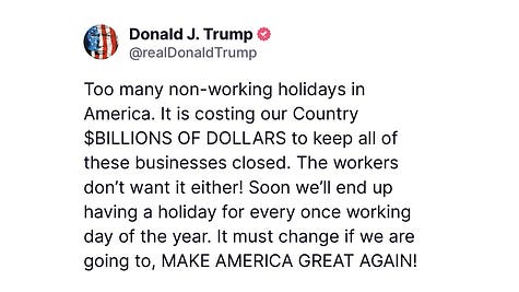 God Hates Lazy—Now Get Back To Work!While the country and world burn, Stephen Miller wants to cancel your long weekends—because nothing says “freedom” like fewer holidays and more unpaid overtime.You can almost hear it, can’t you? The gentle, nasal whisper of Stephen Miller slithering into the presidential ear canal like a snake that read Atlas Shrugged too many times: “Sir, Americans are resting too much. Too many days off. It’s hurting the GDP.” And before you can say “please don’t cancel Labor Day,” we’ve got a new post on Truth Social: “Too many non-working holidays in America!” No, seriously. That’s the message coming out of the White House bunker this week, dropped like a moldy sandwich on Juneteenth, of all days—a holiday that, just a few short years ago, passed with overwhelming bipartisan support. But now? Suddenly, it’s public enemy number one. Not because it’s controversial (it isn’t), or costly (it’s negligible), but because somebody—probably the same guy who thought putting kids in cages was sound immigration policy—decided holidays are making America lazy. Let’s pause for a second and try to absorb the ridiculousness of this. Americans—who already get the least paid time off in the industrialized world—are somehow being blamed for having too many days off. We’re the country that practically worships hustle culture, that celebrates people for working through illness, skipping vacation, and dying at their desks. You know what they call that in most countries? A labor violation. And yet, here we are, with the president—or more accurately, his dark-arts Rasputin of domestic policy—claiming that our handful of sporadic holidays, days people use to visit family, go camping, sleep in, or just breathe, are a drag on the economy. They say it’s costing “billions.” Of course, there's no data, no math, no report—just the usual fog of vibes, grievance, and projection. Let’s talk facts. The United States has zero statutory requirement for paid vacation. None. We don’t guarantee workers a single day off. Not for Christmas. Not for the Fourth of July. Not even for giving birth. And despite that, a full 25% of American workers still don’t get any vacation or holiday pay. Not a single day. And those who do? Nearly half don’t take all of it, often out of fear they’ll be penalized, replaced, or seen as “not committed enough.” Compare that with Austria: 25 days of paid vacation and 13 national holidays. France and Spain offer 36 total days off. Germany: 30. The UK: 28. Even countries with reputations for being hyper-productive, like Japan and South Korea, mandate over 25 days of time off. Mexico, often dismissed by the MAGA crowd, offers 12 vacation days after the first year—and bumps that up over time, plus a vacation bonus. What do they understand that we don’t? That rest isn't the enemy of productivity—it’s the fuel. That workers aren't lazy—they're human. And that a nation that doesn’t allow its citizens to pause, reflect, and recharge is a nation sprinting toward burnout and collapse. But what’s most galling here—what makes this latest assault on common sense so bleakly comic—is how out of touch it is with actual public sentiment. Americans love their holidays. They plan their lives around them. They endure months of daily grind for that one long weekend in July, or the sacred stretch between Thanksgiving and New Year’s. Strip that away and what do you have? A hollowed-out work culture fueled by resentment, fatigue, and Red Bull. But sure—let’s “Make America Great Again” by telling exhausted people they don’t deserve a Monday off. This isn’t governance. This is culture war cosplay. It’s a desperate attempt to win points by poking the bear of so-called “entitlement” culture—which in this case just means being allowed to take your kid to the beach without checking Slack every five minutes. It’s the politics of bitterness, dressed up as policy. And let’s be real: this isn’t even Trump’s idea. He doesn’t wake up thinking about labor laws or national calendars. He’s thinking about polls, lawsuits, and whether someone’s been mean to him on cable news. No, this holiday-hating nonsense reeks of Miller—this is textbook Millerism. Something stiff and mean, cooked up in a policy dungeon, designed to punish the idea of collective joy, rest, or leisure. And it’s so deeply unpopular, so weirdly joyless, that even some Trump voters are probably blinking twice and saying: “Wait, he wants to take away Memorial Day weekend?” Because say what you will about America—we may be divided, we may be struggling, we may be clawing our way through political quicksand—but we still know how to cherish a freakin' holiday. We still believe in the simple dignity of a long weekend. So if this administration thinks cutting back holidays is the path to greatness, they’re not just wrong—they’re stupid. Because anyone who sees joy, rest, and family time as threats to national prosperity isn’t leading a country. They’re managing a sweatshop. And the American people? We’re not having it. THIS IS A CRITICAL PERSONAL APPEAL If you’re reading this, you’re already part of the resistance. You believe in truth. In justice. In dragging the roaches of corruption into the light. But let me be brutally honest: I can’t do this without you. This isn't just another newsletter; it's a war cry. A movement. A battering ram aimed at the liars, the grifters, and the authoritarian wannabes hijacking our democracy. And we need to grow this platform into a voice so loud, so relentless, that they can’t spin it, silence it, or shut it down. I’m calling on you—not passively asking, but urgently demanding—to fuel this fight. We are the last line of defense between democracy and dictatorship. And yes, as a small token of my appreciation, the first 240 Founding Members will receive a sign
