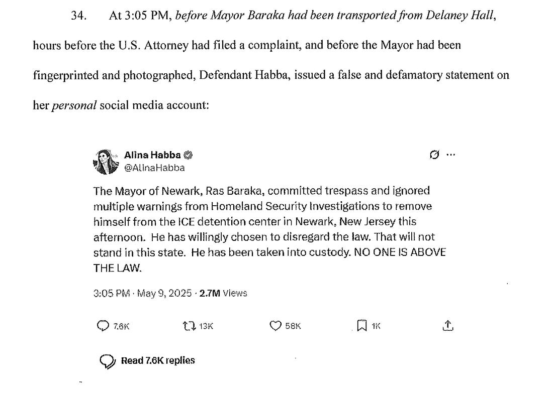 Today, the expected lawsuit by Newark, New Jersey Mayor Ras Baraka dropped. Baraka alleges unlawful conduct by Trump’s U.S. Attorney and former lawyer Alina Habba, and Ricky Patel, the Special Agent in Charge of DHS’s Newark Division office of Homeland Security Investigations, acting in their private capacities (to avoid public official immunity). Baraka is suing for “false arrest and malicious prosecution” as a result of the incident at a New Jersey ICE detention facility where he accompanied members of Congress to investigate. New Jersey Congresswoman LaMonica McIver is facing charges that we discussed here.