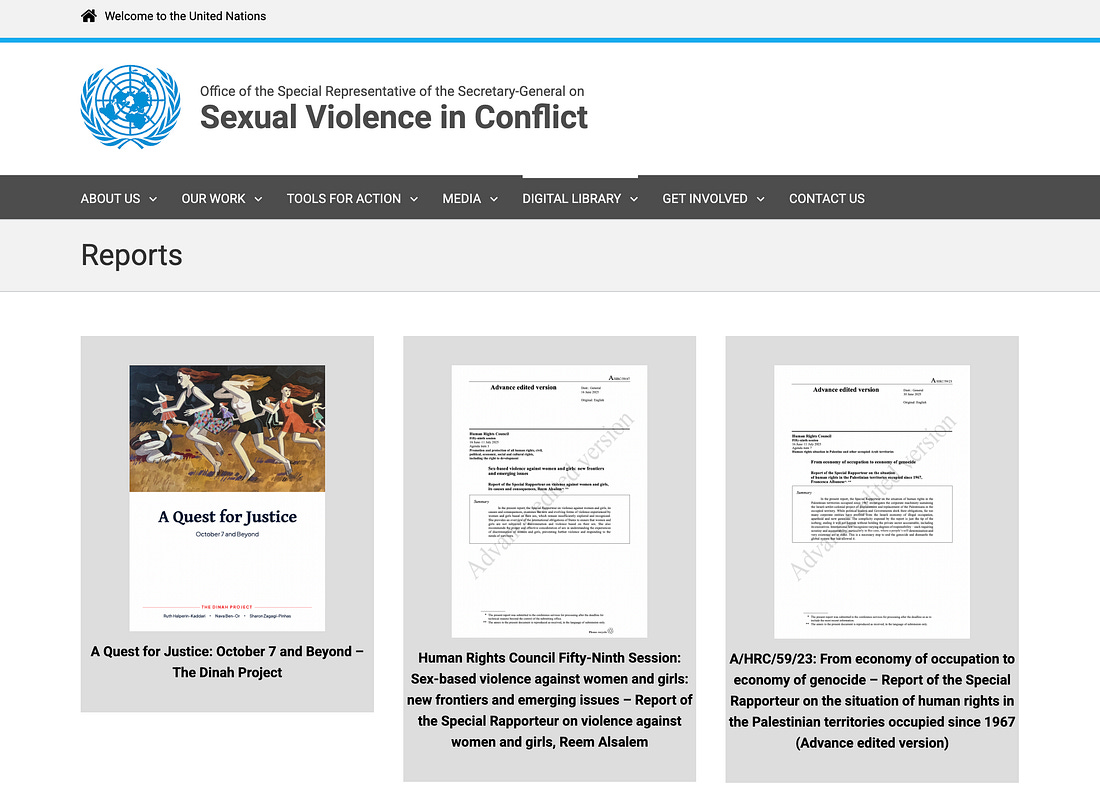 It also doesn’t seem to matter that such standards have not been necessary in other instances of violent conflict. “Traditional approaches to prosecuting sexual violence rely heavily on direct victim testimony, which is often unavailable in conflict settings,” the report claims. That, however, is simply not true. Whether the violence has been carried out in Sudan, Rwanda, Myanmar, or in Israeli detention centers, investigators are indeed able to find direct victims when the sexual assault is systemic. In a move that is highly unusual, the Dinah Project report is now hosted on the UN’s website among its own reports on sexual violence and global conflict. Drop Site News asked Patten why she was hosting the report, but she did not respond. The argument, if taken up by the UN, “carries concrete implications,” the authors say, principally that it would implicate UN Resolution 1960 and lead to Hamas being added to a UN blacklist for entities that use sexual violence as a weapon of war. Another goal, they say, is also to “impose targeted sanctions.” “We have to bear in mind that the UN has to date not designated Hamas as a terrorist organization,” Halperin-Kaddari told Ynet. “This is obviously because of political reasons. … Blacklisting Hamas would be one step in finally remedying this totally unacceptable situation, and it would encourage more countries to sanction Hamas. Blacklisting Hamas will finally expose them as rapists and not as freedom fighters.” UN official Alsalem noted that Israel thwarted any official investigation. The UN’s commission investigating possible sexual violence “was also unable to independently verify specific allegations of sexual and gender-based violence due to Israel’s obstruction of its investigations,” she said. The UN fact-finding mission led by Patten and so dearly held by the Dinah Project, at times, directly contradicts what the Dinah Project argues.