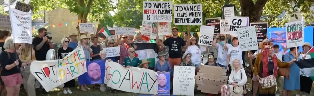 Newsom Goes On Offense, Bowser Gets Louder, UK Protests Vance, and MoreTrump’s distractions are failing miserablyWhile Trump turns the Kennedy Center Honors into a pageant celebrating himself, I’m glad to have some great news for you. I hope it brings you some relief, even if just for a moment. This movement—from our fearless reporting, to our relentless advocacy—is supported completely by our readers. No billionaires. No advertisers. No nonsense. So if you haven’t yet, I hope you’ll support our work by becoming a paid subscriber today. It helps fuel our non-stop fight against the Trump regime DANCE AGAINST VANCEJD Vance is once again on a luxurious vacation with his family—this time in the UK. It’s nice not having Vance here in the US, since everything he does is horrible. On Tuesday, folks hosted a “not welcome” dance party for Vance in England. Protesters held signs that read: “JD Vance’s Netflix password is ‘password,’” and “Cotswold childless cat ladies say go home.” There were chants of “shame on you,” and a special JD Vance cake. It was an event to remember. Vance then traveled to Scotland, where he was greeted by more protesters. PROTEST IN ARKANSASIn Arkansas, Education Secretary Linda McMahon held an event at a public elementary school with Gov. Sarah Huckabee Sanders. Protesters gathered outside to speak out about the duo’s hypocrisy. Touring public schools, while sabotaging them behind the scenes, isn’t outreach—it’s theater. BOWSER GETS LOUDERFollowing Trump’s hostile takeover of Washington, DC, Mayor Bowser said the “community needs to jump in … to protect our city.” She added that we must form a “backstop to this authoritarian push,” by electing a Dem majority in the House. Trump’s DC takeover is based on a lie. It’s an effort to distract from his Epstein scandal, and his rampant corruption. Which reminds me—where are the Epstein files? INDIANA PUSHES BACKJust last week, hundreds of people protested outside of the Governor’s Residence in Indianapolis. They were calling out IN Gov. Mike Braun’s attempt to steal Dem House seats. State Rep. Ed DeLaney said: “no Hoosier voters are asking for this … this is DC politics invading our state.” CALIFORNIA GOES ON OFFENSEIn a series of social media posts, Gov. Gavin Newsom announced he’s moving forward with his plan to redraw House districts in California. Great. Let’s make it happen. I’ve been taking on Trump and his cult for nearly a decade. And not just with my reporting. I also run one of the largest social media campaigns against Trump—and organize one of the biggest Contact Congress initiatives out there. But we need all hands on deck so we can take this work to the next level. If you haven’t yet, please support our fight against the Trump regime by becoming a paid subscriber today Onward! Scott Help amplify this news by liking the post and re-stacking using the ♻️ button below! Do you have a win to celebrate—big or small? I’d love to hear it! For all contact Congress links, or to volunteer, you can go here: https://actionnetwork.org/forms/sign-up-for-the-watchdog-coalition NEW-Tell Congress to push back on Trump’s DC takeover: https://tinyurl.com/2jpp94yk Links to everything we are doing: https://www.dworkinsubstack.com/p/how-were-fighting-trump Tell Congress to support law to unmask ICE: https://tinyurl.com/bp8cau82 Tell Congress save the National Weather Service: https://tinyurl.com/bdbur8df Tell Congress to investigate the Jeffrey Epstein trafficking case: https://tinyurl.com/4pfh2p4f MomsRising.org published a PETITION that includes STATEHOOD FOR WASHINTON D.C. QUICK SIGNATURE: Stand down the federal attacks on DC MomsRising.org Where moms and people who love them go to change our world Tell your member of Congress to: Stand down the escalation of federal forces in DC! Take Action Now https://action.momsrising.org/sign/DCFederalTakeover/?t=17&utm_campaign=outreach&utm_medium=email&utm_source=actionkit&akid=21086%2E3508377%2Er4ZeUV At a press conference Monday afternoon, President Trump declared that he’s taking over the Metropolitan D.C. police and sending the National Guard into the city. Citing a public emergency due to a surge in violent crimes in DC. The fact is, President Trump's claims that there is “rising violence in the capital” is false. In fact, violent offences fell after reaching highs in 2023 but in 2024, they hit their lowest levels in 30 years. [1] What’s taking place in DC is nothing new. The Trump administration has targeted DC and its allies before. DC will not remain silent but it needs your help. Tell your member of Congress to stand down the escalation of federal forces and respect DC. Here’s what’s happening: The President has formally declared a public safety emergency, stating that the Justice Department is now in charge of the Metropolitan Police Department. With plans to activate and deploy 800 National Guard. The troops will start to appear on DC streets as soon as this week, working in shifts of 200 to provide “a physical presence in support of law enforcement.” [2] However, the data is the data and it shows that DC is currently at a 30-year violent crime low and DC's crime stats show that violent incidents have dropped this year. What’s clear is that crime is falling in DC; there’s been a substantial drop in violence since the summer of 2023. [3] The dismal and bleak image that the administration paints, is not the reality for many DC residents. In fact, District leaders have condemned the President’s actions and criticized the takeover of the police department. [4] Tell your member of Congress to stand down the escalation of federal forces and respect DC. Here’s how you can help: DC is home to 700,000 residents but they don’t have a single voting member in Congress. Meaning, there is no one to advocate on their behalf so we’re asking for help from allies across the country